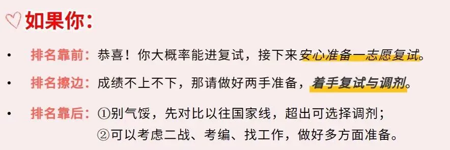 为大家拿高分欣喜之余,学姐忍不住又想唠叨几句啦:如果你高分,大家也都高分,先不要高兴太早。高分云集下,能否进复试还是要看排名的!所以出分后,别忘记关注排名,好做下一步打算!