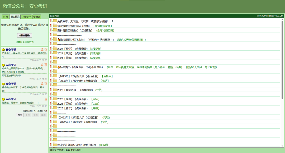 也是一个专注考研课程资料分享的网站,网站只支持手机端网页访问,免费分享,没有广告,通过网页端看到,同样是收集了很多最新的各科考研课程和专业资料,分享的资料也以百度网盘分享。