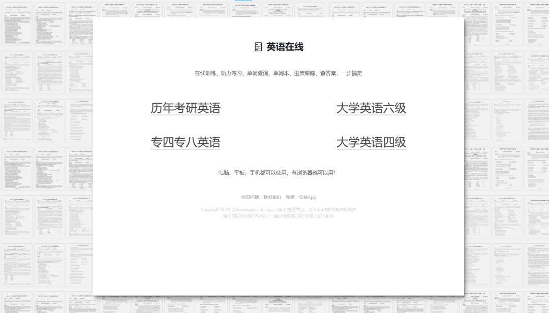 https://zhenti.burningvocabulary.cn/专注于分享英语考研、四六级、专四专八真题的网站,也是众多博主推荐的常客了,网站提供有在线训练、听力练习、单词查询等功能,对于查找考研类英语真题还是非常有帮助的。