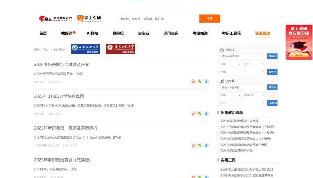 和上面网站不同的地方在于属于综合网站,既可以查找考研方面的相关备考信息和咨询以及经验分享贴,同时也可以在里面搜索各科考研真题,便捷省事。
