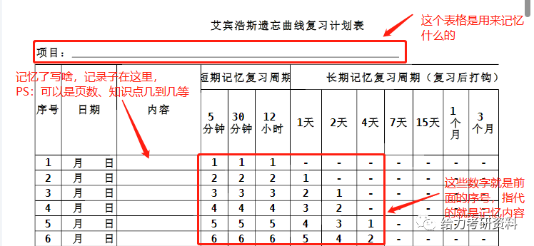 tips:貌似很多小伙伴看不懂这个表格,简说艾宾浩斯表格如何使用且看这张图: