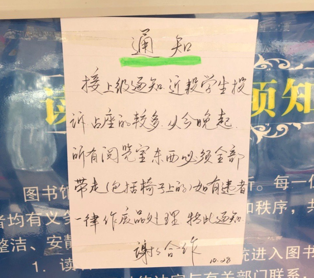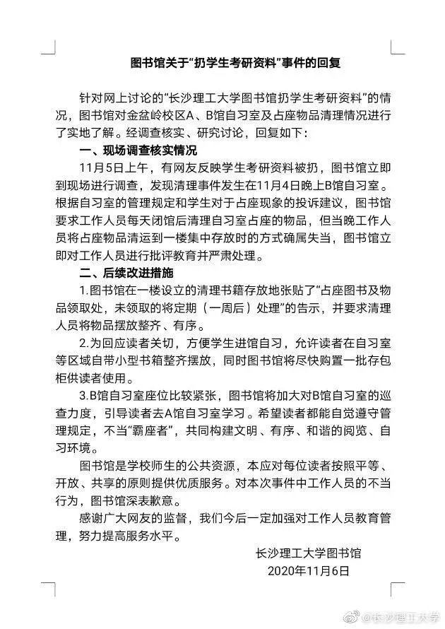 对此图书馆老师回应称,很多同学投诉书籍占位置现象严重,所以才要求物业管理人员在闭馆的时候把占座的书本清理掉,行为确实不妥,有些简单粗暴,现已被制止。学校随后也作出回复:“对工作的失当行为表示歉意,下一步将规范工作管理,努力提高服务水平。”