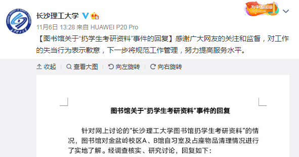 针对“长沙理工大学金盆岭校区学生的考研复习资料被乱扔”一事,11月6日中午,长沙理工大学官方微博回应称,做法欠妥,深表歉意,图书馆已批评、处理涉事工作人员。