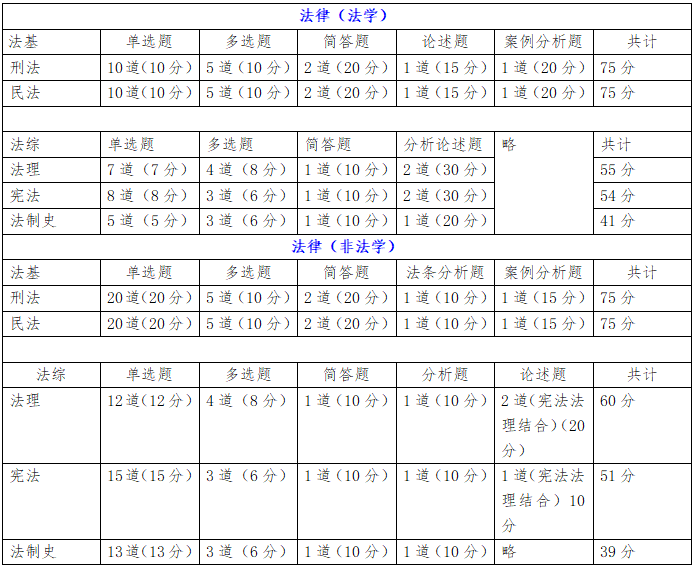 ②基础课中,刑法民法各占75分,综合课中,法理学约占60分,中国宪法学约占50分,中国法制史约占40分。