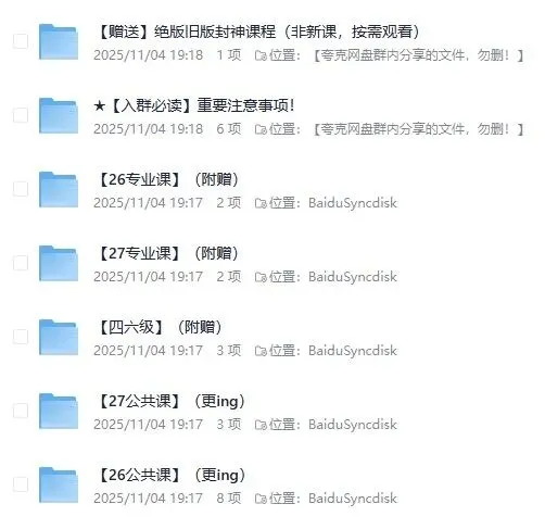 赠送2026全年的政治、英语、数学各机构公共课和专业课考研资料,还有电子书籍、试卷、四六级、考研经验等文档资料,经过长期的测试,一切更新正常,请大家放心,目前群内资料大约有30TB,还将持续更新。