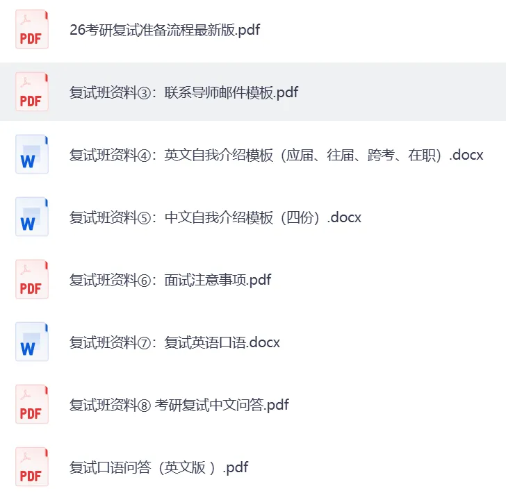 这份26考研复试资料包涵盖复试全流程所需内容,从准备流程、中英文自我介绍模板,到联系导师邮件范本、面试注意事项,再到口语问答、调剂宝典等资料一应俱全,还收录了北大研一学长的复试经验与100道核心复试问答。其优势在于资料分类清晰、针对性强,既提供标准化模板帮考生快速完成文书准备,又通过真实经验和高频问答拆解复试难点,甚至覆盖跨考、在职等特殊身份的适配内容。考生借助这些资料,能系统梳理复试思路,规避联系导师、面试表达的常见误区,高效提升复试备考效率,大幅降低备考盲目性。