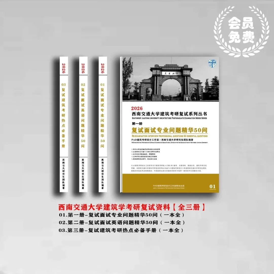 02、复试全套资料:含专业问题精华50问(含答题模板)、英语问题精华50问(含答题模板)、建筑复试面试必备热点手册,26考研必备资料!