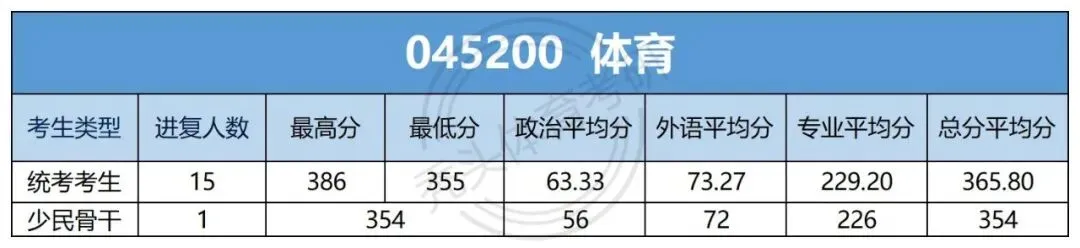 体育专硕一志愿统考15人,初试总分最高分386分,最低分355分,政治平均分63.33;外国语平均分73.27;专业课平均分229.2;总分平均分365.8分。