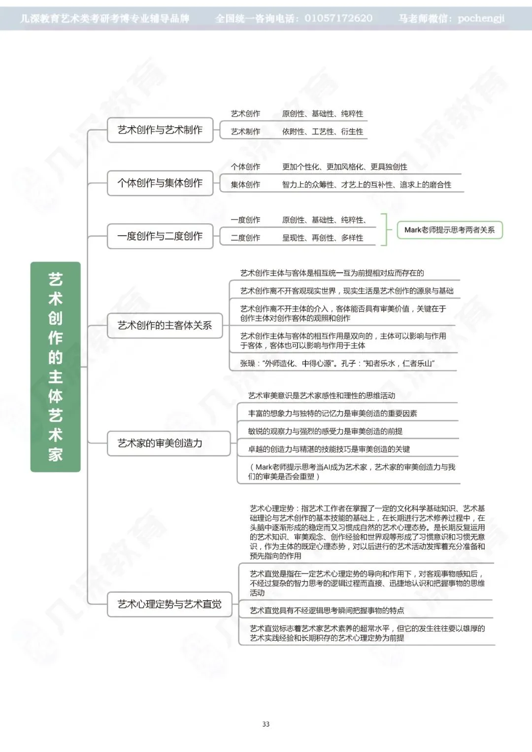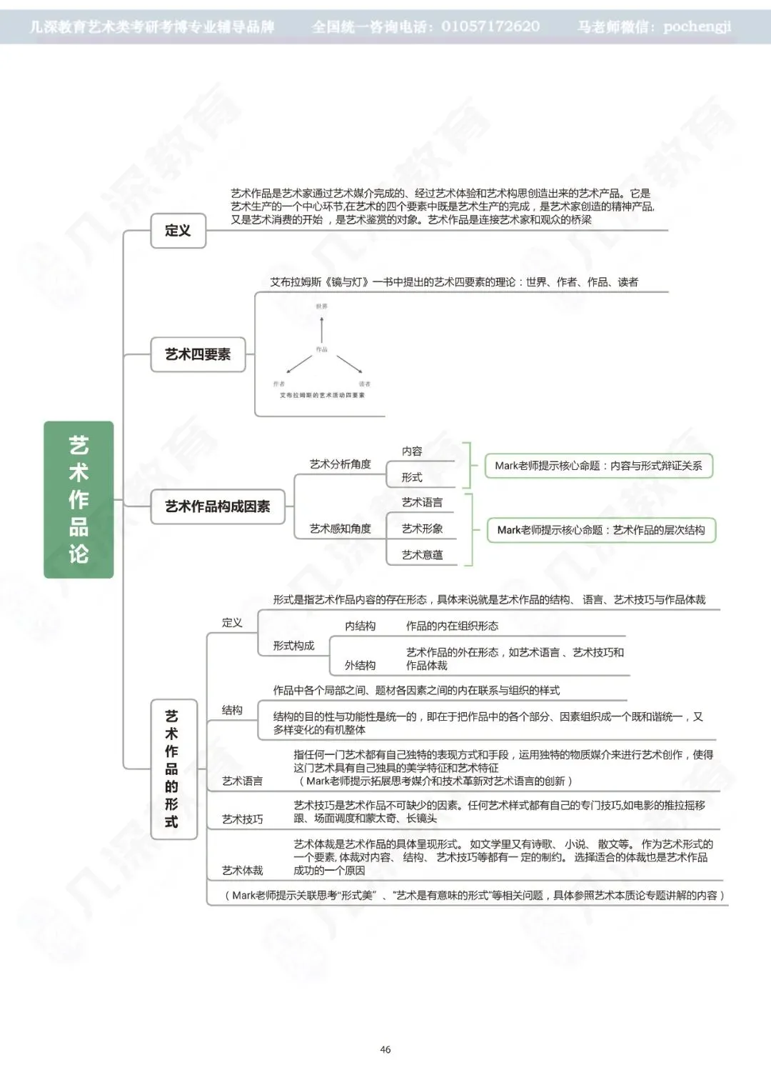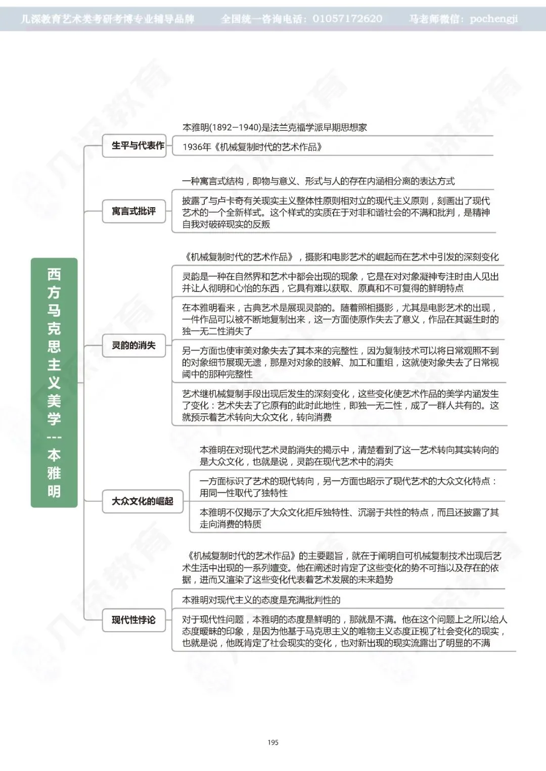 几深教育多年来深耕北京大学艺术硕士,独家研发针对北京大学艺术硕士全系列内部资料,站在更高更专业的起点上助力学员圆梦北京大学艺术硕士。在原有文字精编资料的基础上,强势推出艺术基础科目升级版思维导图!《北京大学艺术基础思维导图》(升级精华版)由几深教育北大艺术硕士教研团队历时2年悉心研发,该资料是对艺术理论、美学理论、艺术史论、中西方美学史论领域数十本教材与专著核心要点的提炼与总结,涵盖北大艺术基础科目95%以上考点。全书【两百余页纯享版思维导图】干货满满,我们秉持:专业、聚焦、系统、高效、极简、美观的原则,全书A4尺寸标准化排版,广播电视、电影、音乐三大方向考生均适用。复习时间宝贵,无需自己费时费力总结,一本在手,备考无忧!配合课程使用效果更佳~关注“PKU艺术硕士考研”,获取最新学术前沿与考情资讯课程咨询,请扫下方二维码添加好友~