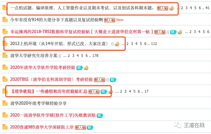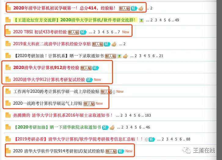 有的学校最上方的帖子是版主整理的考研信息的汇总,包括王道考研官方群、考研信息和资料汇总还有考研经验贴汇总等等,如下图,清华大学的版块上面可以直接看到考研信息、经验贴和资料的汇总,信息非常集中,给大家省了很多收集整理的时间。