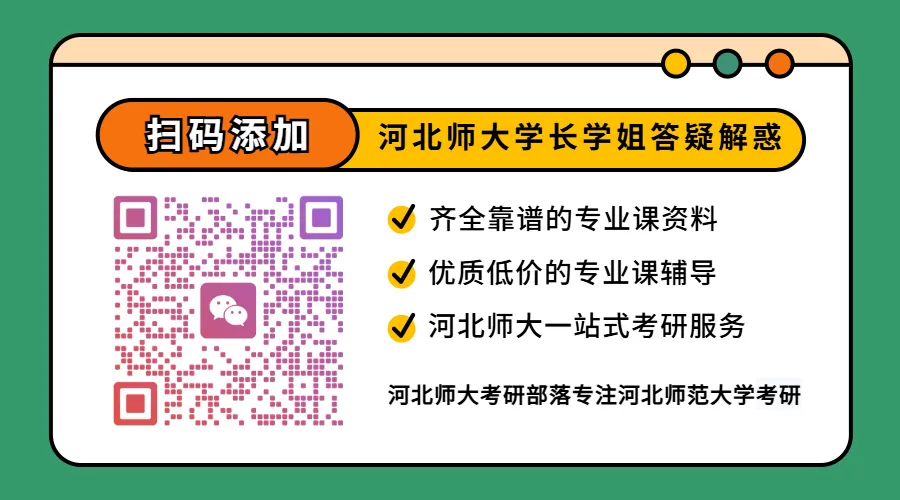 学长学姐们分享的宝贵考研资料,为备考路上的学弟学妹精准点亮了方向,助力大家避开备考误区、高效冲刺~ 为感谢这份无私分享与热忱助力,河北师大考研部落特意准备了专属红包奖励!感兴趣的学弟学妹们,快扫描下方微信二维码添加好友,咨询领取福利吧~