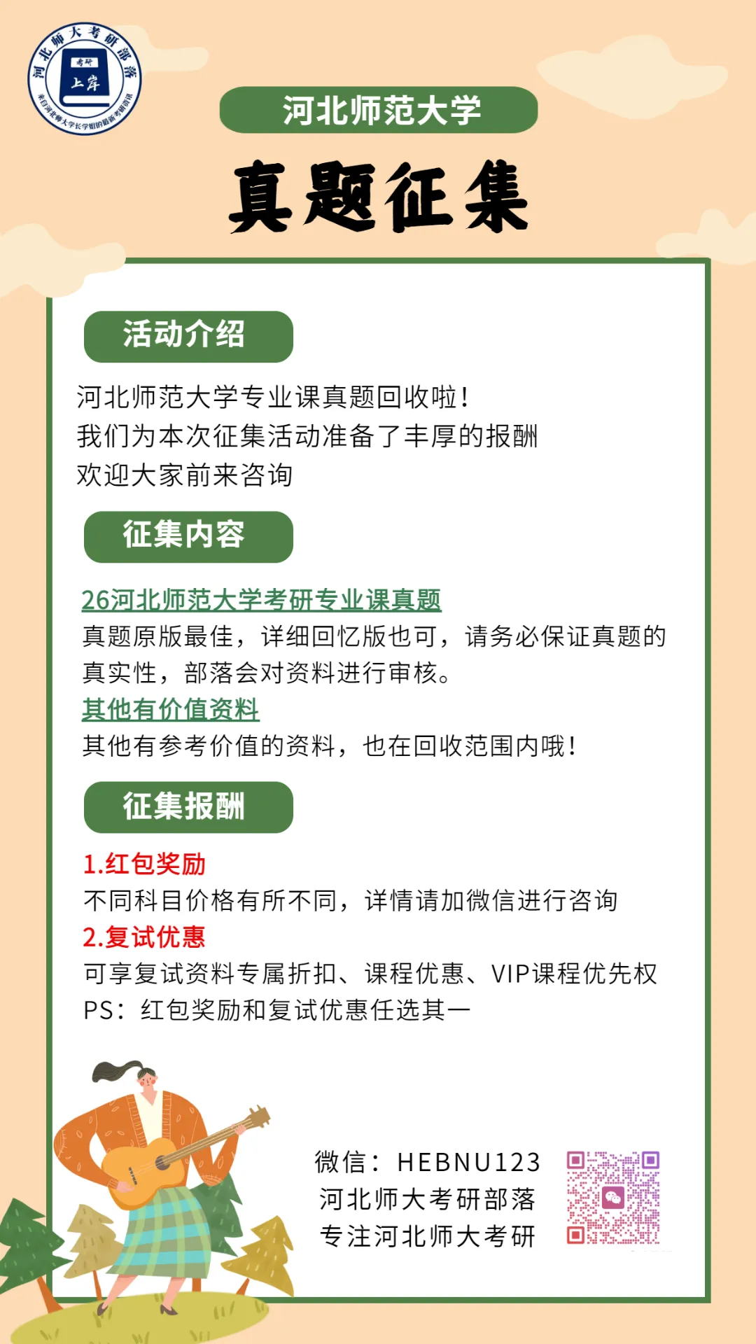 河北师范大学各专业最新考研复试真题、直系高分学长学姐复试笔记以及重点总结等,其他有重要参考价值的资料也在回收范围内。