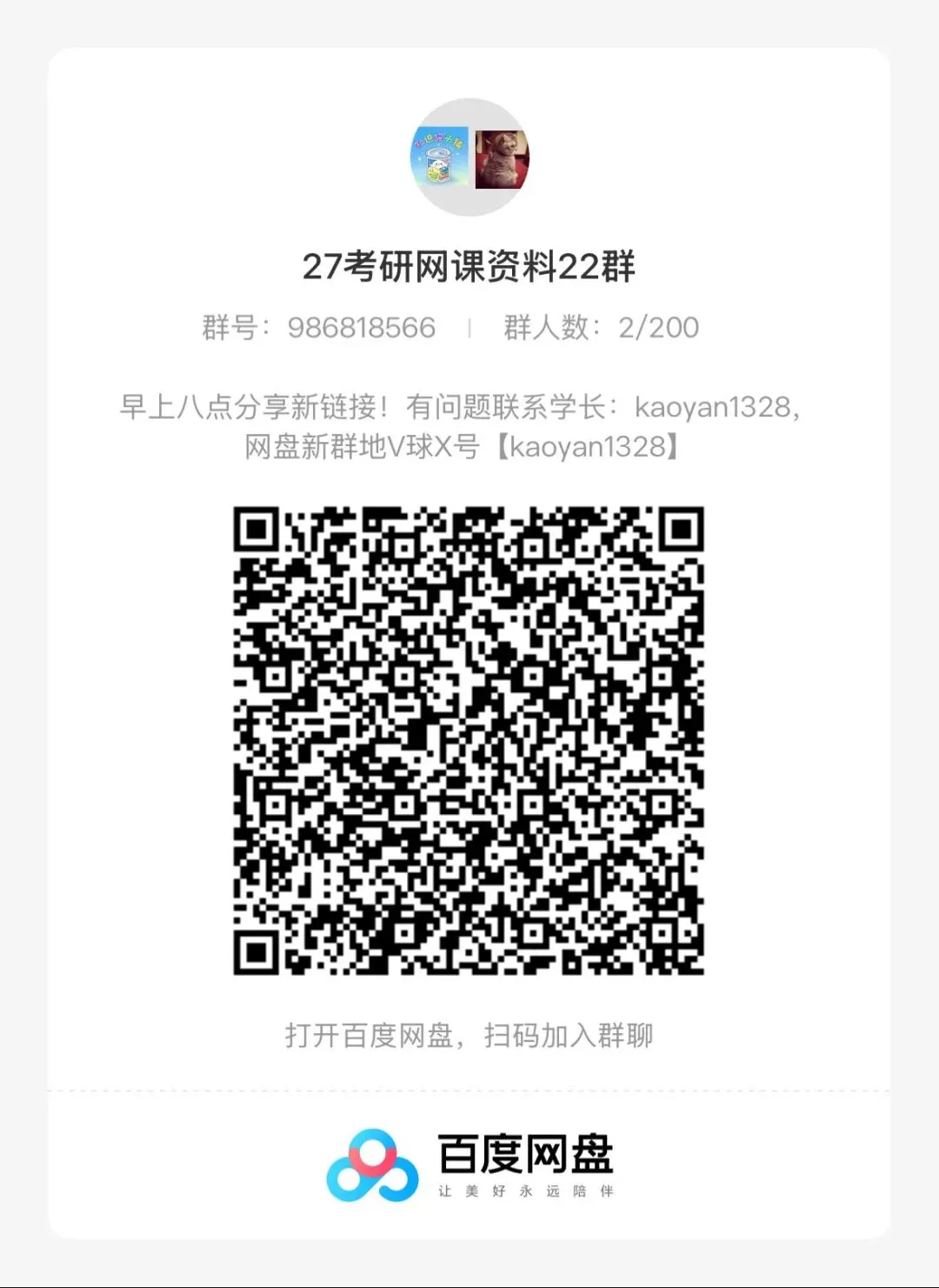 26考研网课资源都整理好了,考研人都在这个群里,我把整理好的考研资料都放在百度网盘群和夸克网盘了,每天同步更新电子资料和视频网课,有需要的宝子们赶紧扫码进群哦,群满或者有问题随时联系我:kaoyan1328