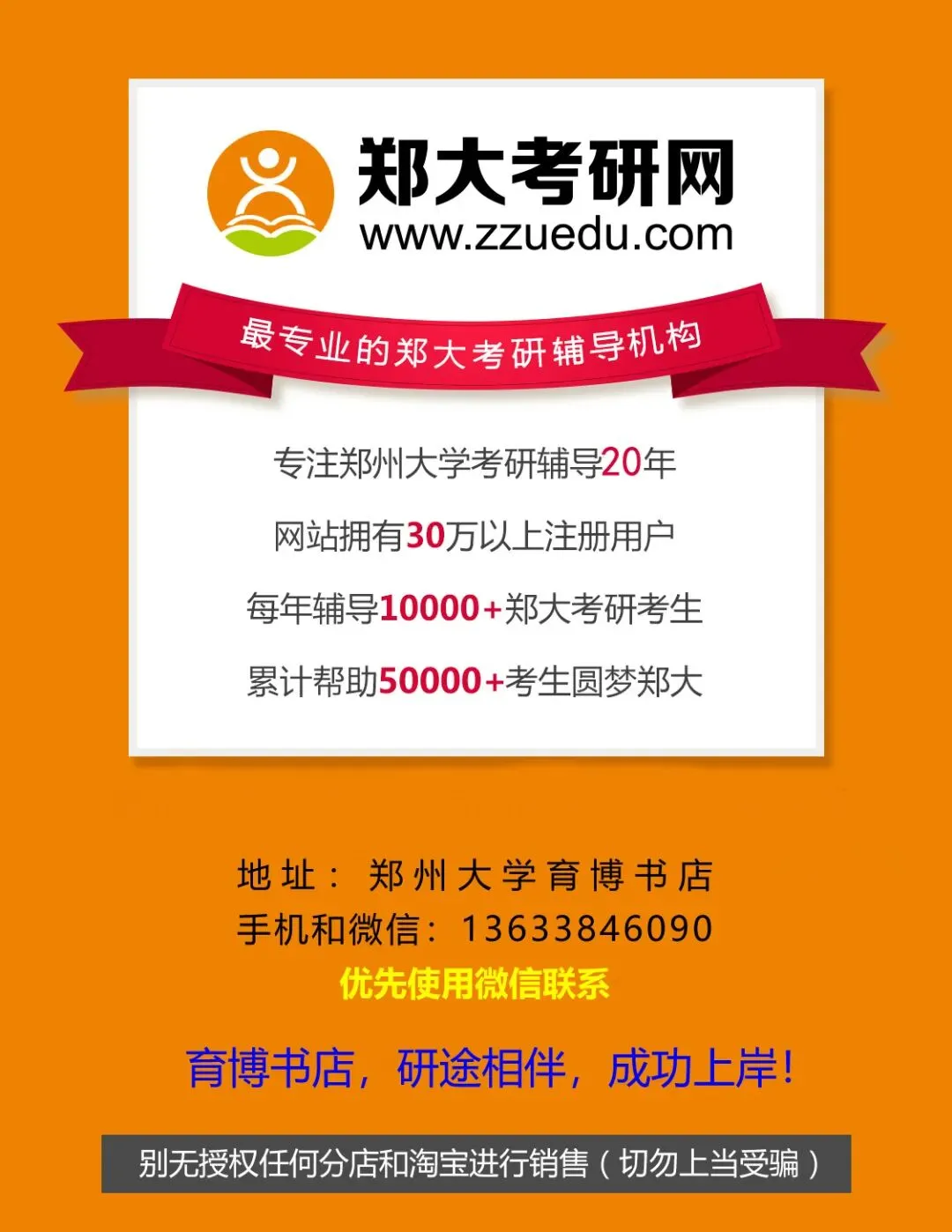 通过网站、微信、微博、QQ等多个平台提供立体化全方位考研服务,每年服务郑大研友超万人,考取郑大更多人选择郑大考研网育博书店!