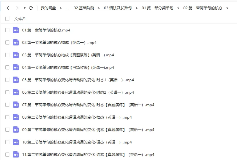 百度云群里面资料从第一节按顺序排列,包括网课视频+上课讲义电子版+纸质书扫描电子版,高清无水印。比如田静的语法课在百度云群组中是下面的样子: