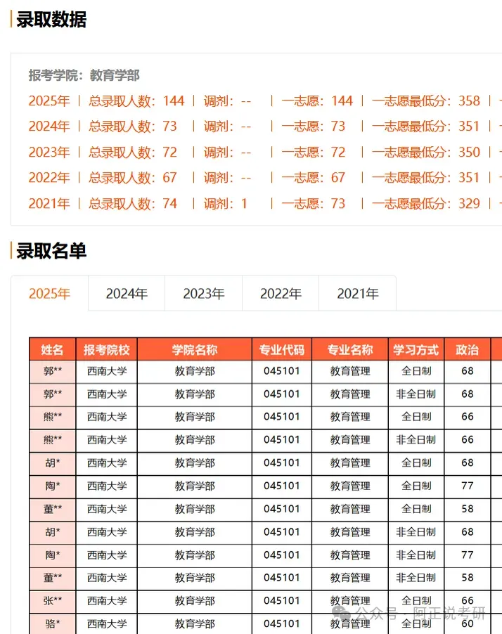 西南大学教育管理同时招收全日制和非全日制,2025考研,疯狂录取了144人,其中全日制72人,非全日制72人。全部144人,都是一志愿上岸,一志愿录取最低分是358分,总体难度不低。想要成功上岸,建议目标分数370分,西南大学是6所部属师范大学之一,强烈建议报考!