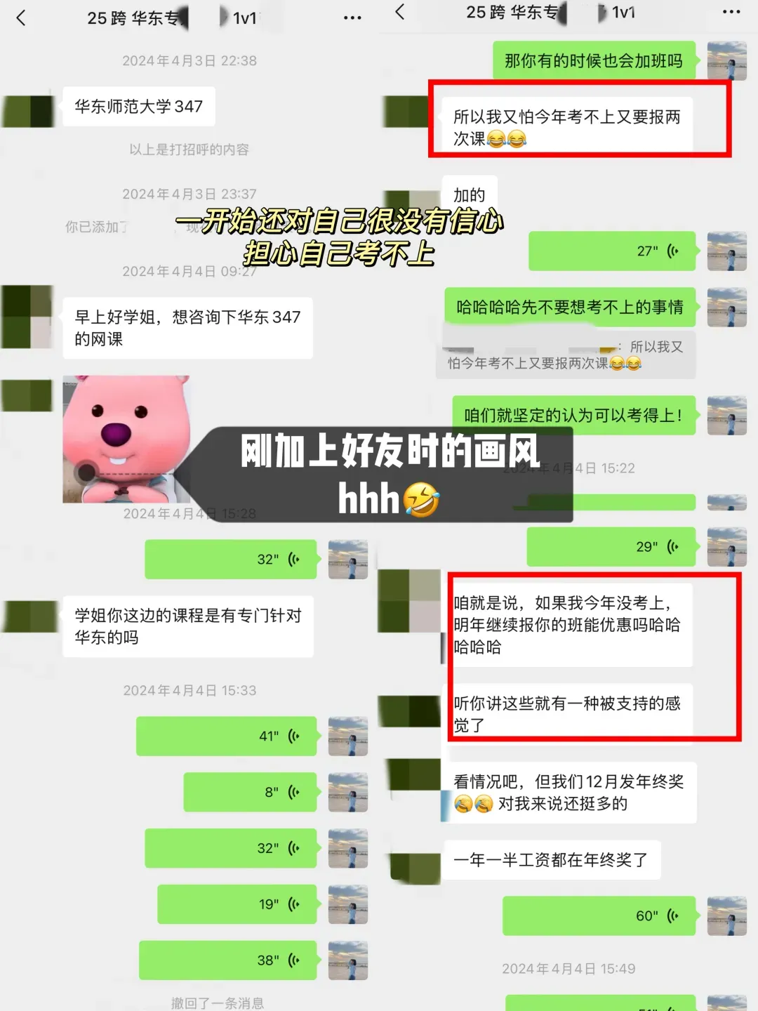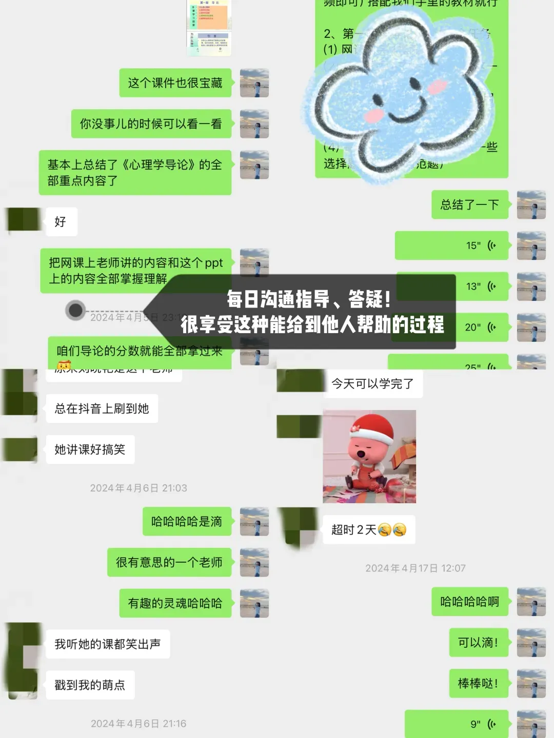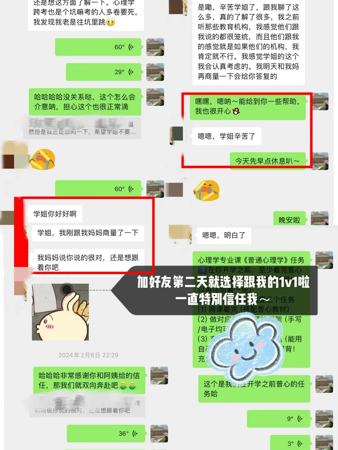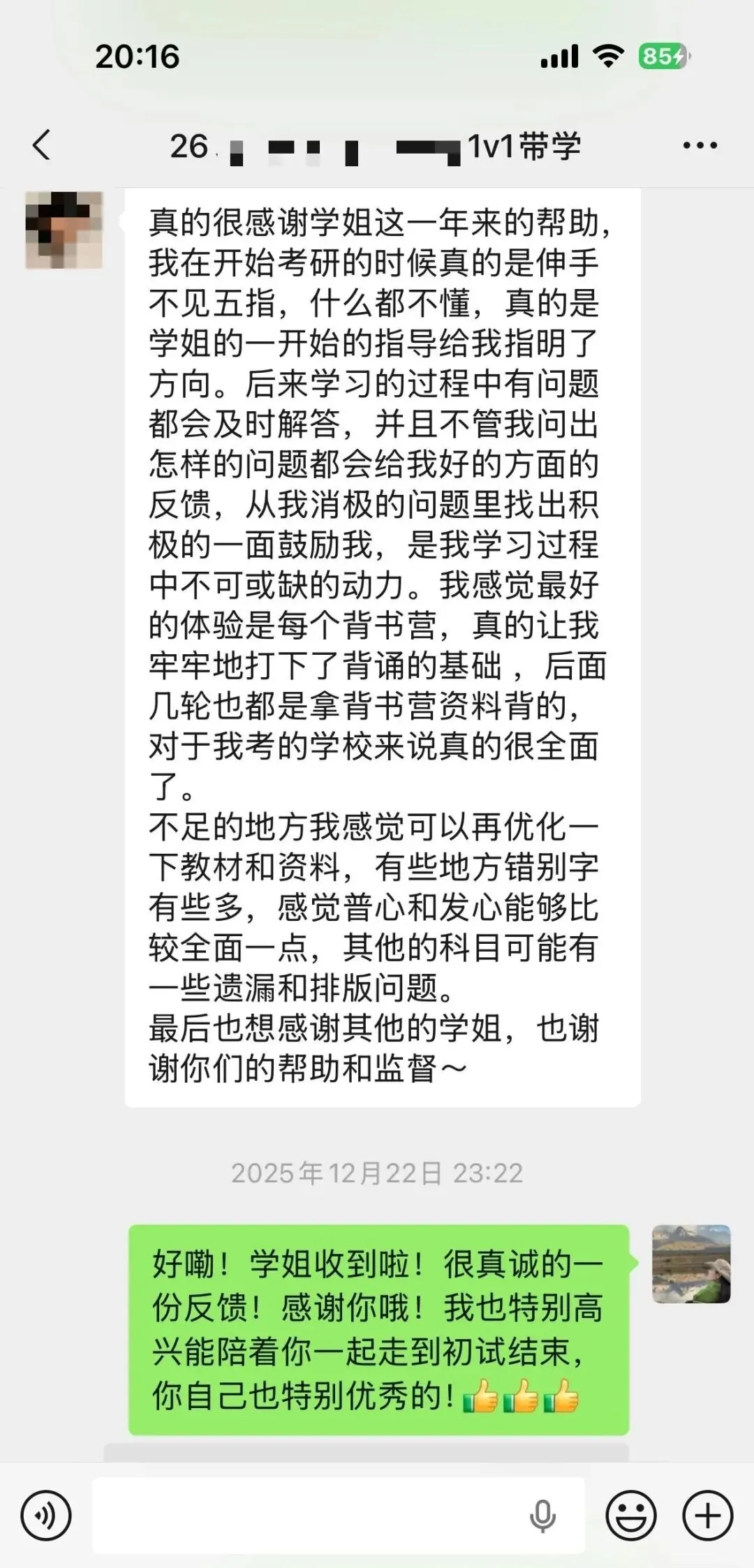 去年2月份加了朵拉学姐微信,加好友的第二天就跟了学姐的1v1全年带学(哈哈哈有缘分的人无需多言,我也没有辜负这一份沉甸甸的信任,真的陪她上岸啦!),辅导的一年多,帮她规划每科的学习、给她答疑指导、心态调整、日常监督等,后面也见证了她一战上岸,该怎么形容呢?就好像自己种下的种子,开出了耀眼花朵的感觉hhh