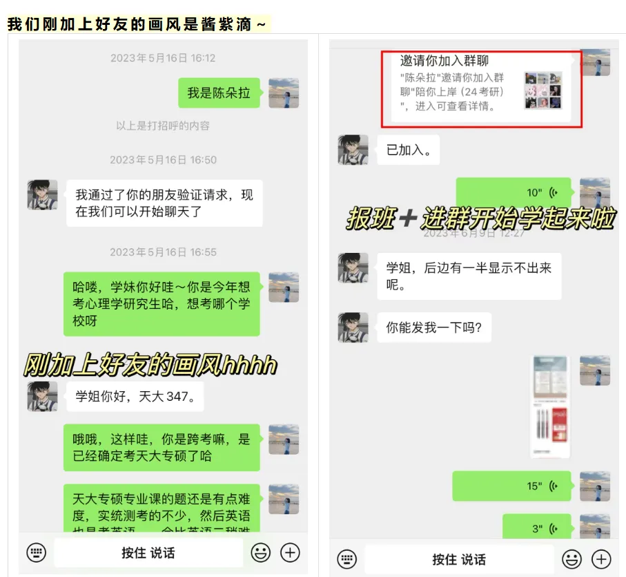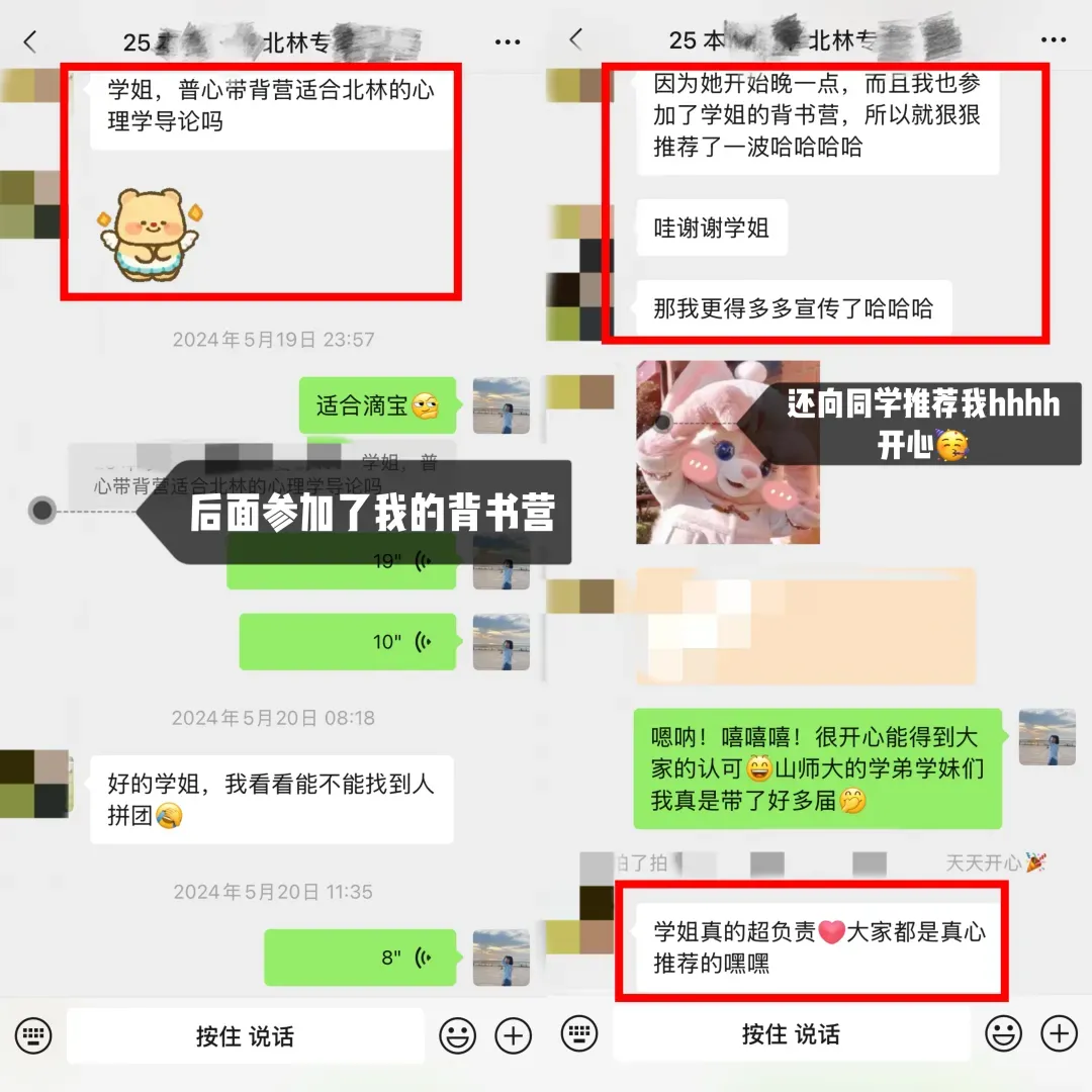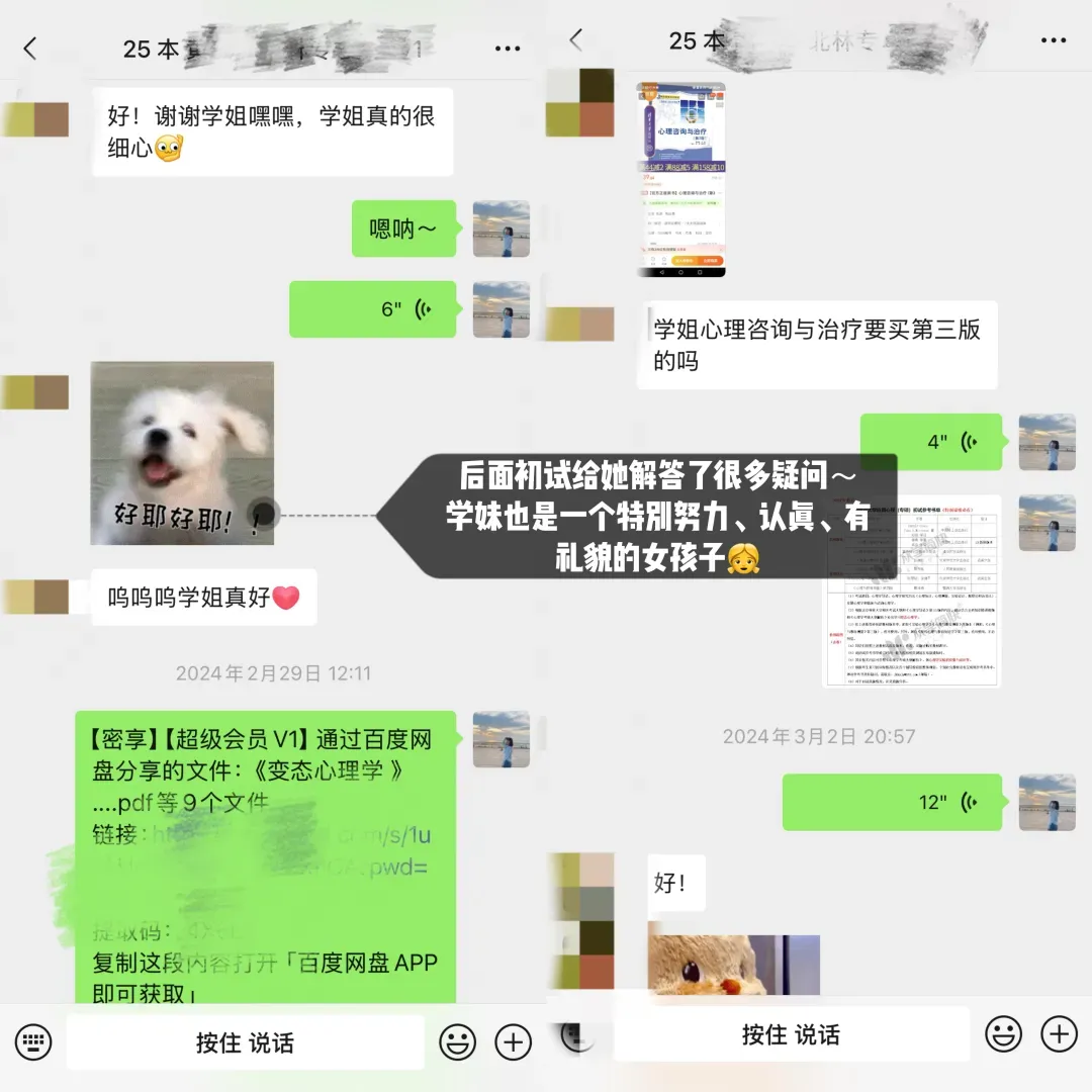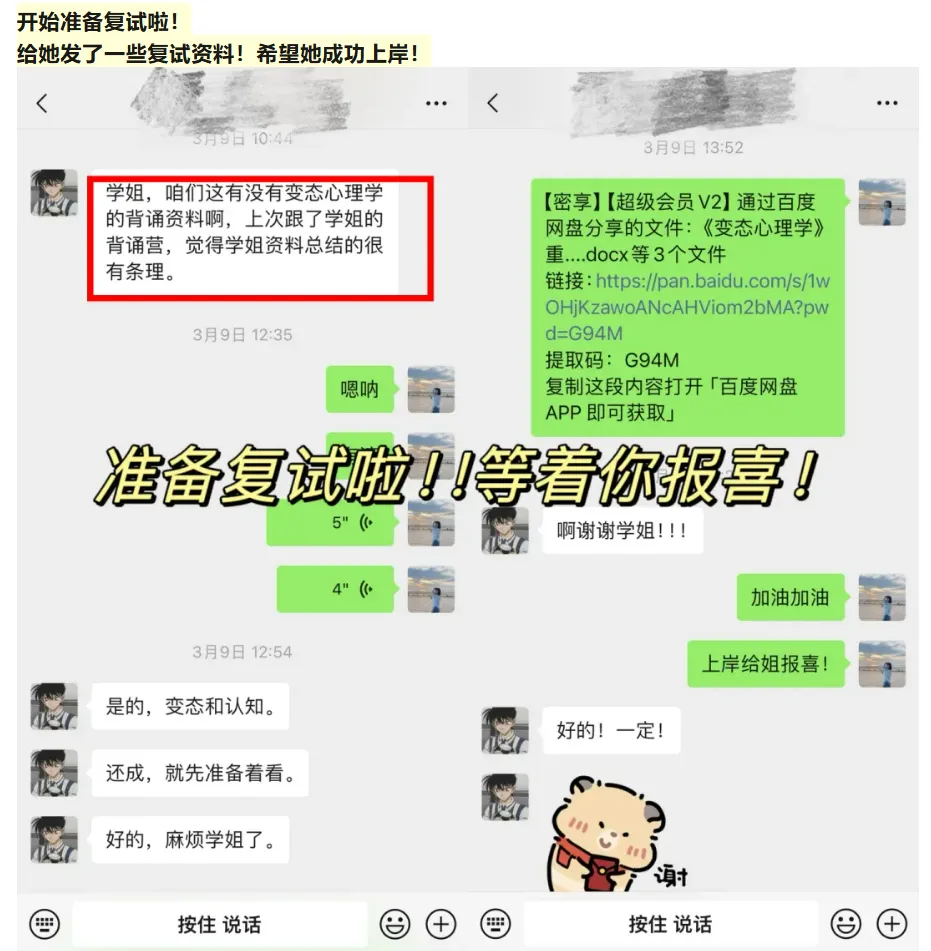 学妹当时加我是23年(备考24考研),是一名跨考的考生,后面备考也是一直跟着相关的指导和课程学习,后面又报名了我的心理学考研背书营,复试的时候也给她进行了一些指导和分享资料,再后面就成功上岸天大啦!超优秀!超厉害的一位学妹!