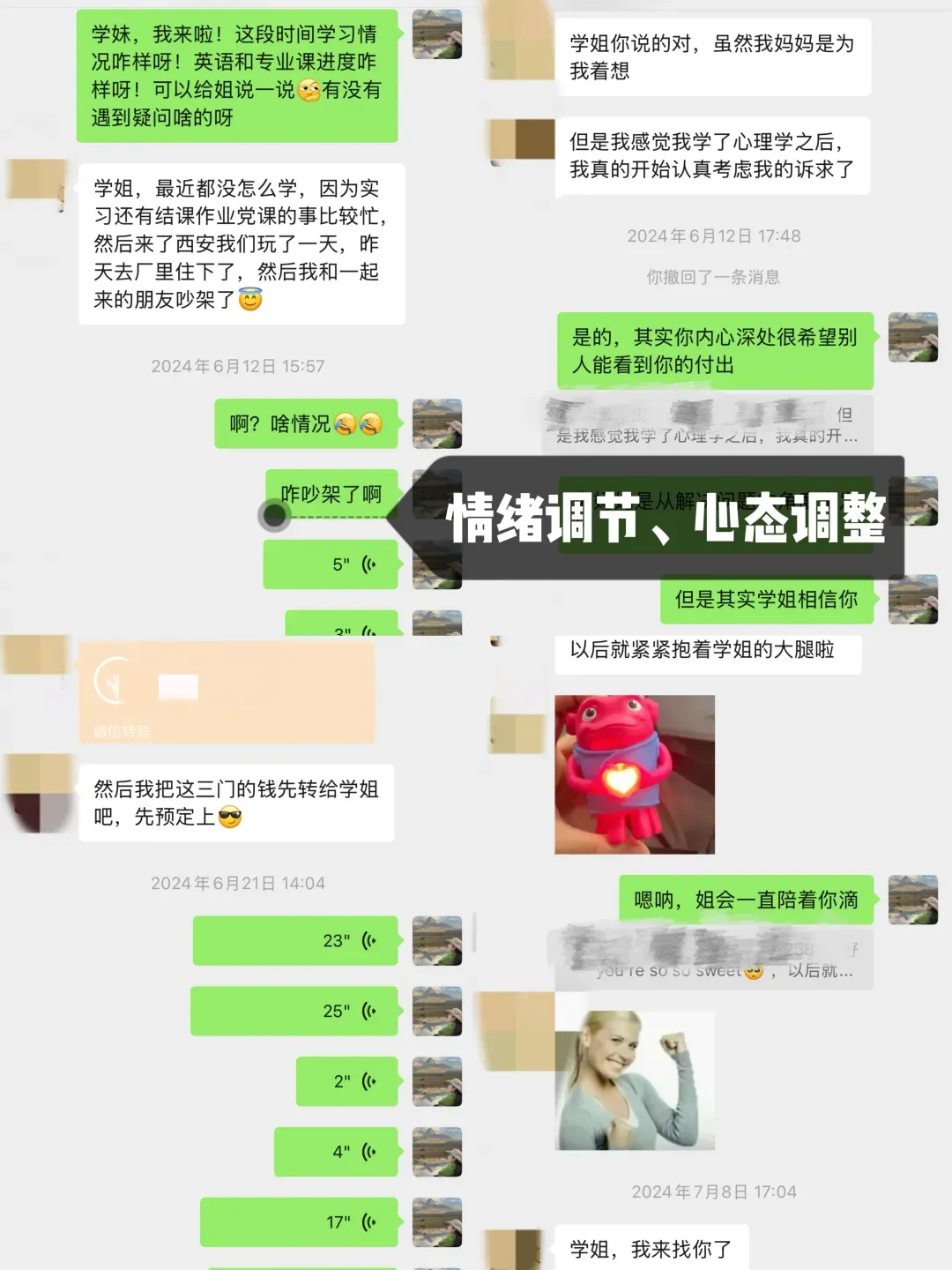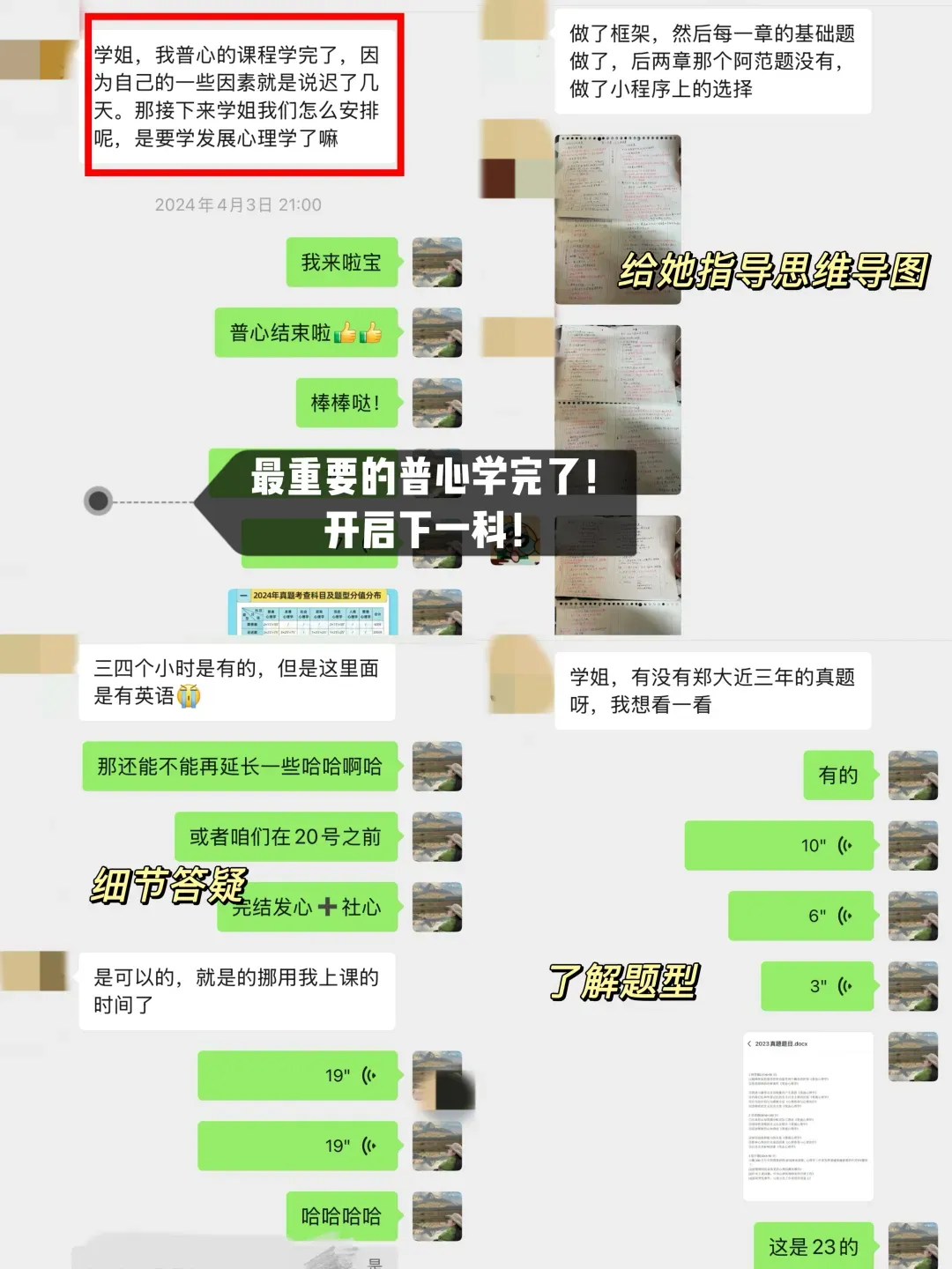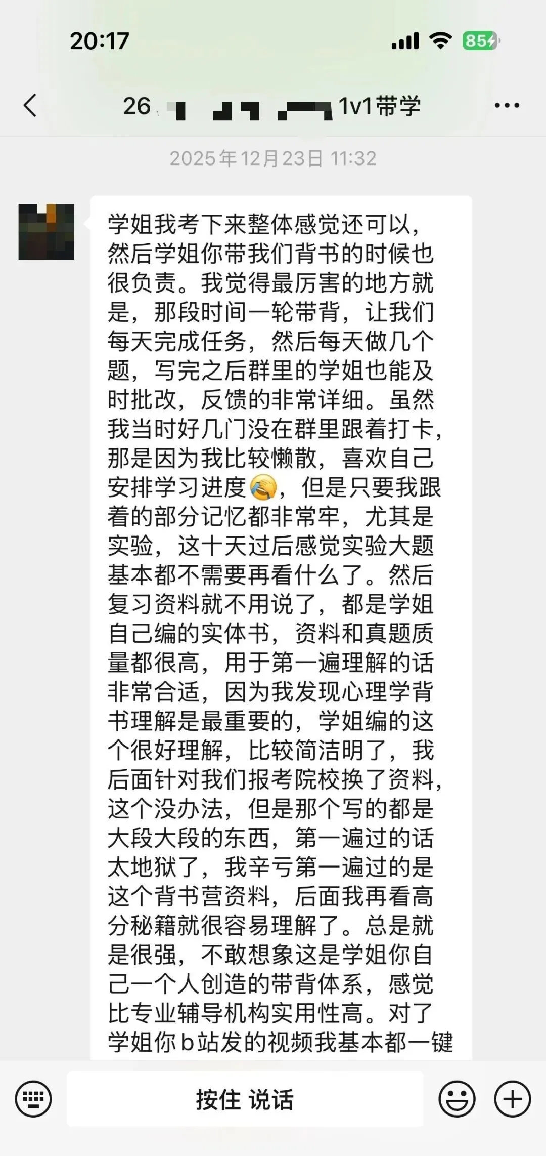 学妹当时加我是23年(备考24考研),是一名跨考的考生,后面备考也是一直跟着相关的指导和课程学习,后面又报名了我的心理学考研背书营,复试的时候也给她进行了一些指导和分享资料,再后面就成功上岸天大啦!超优秀!超厉害的一位学妹!