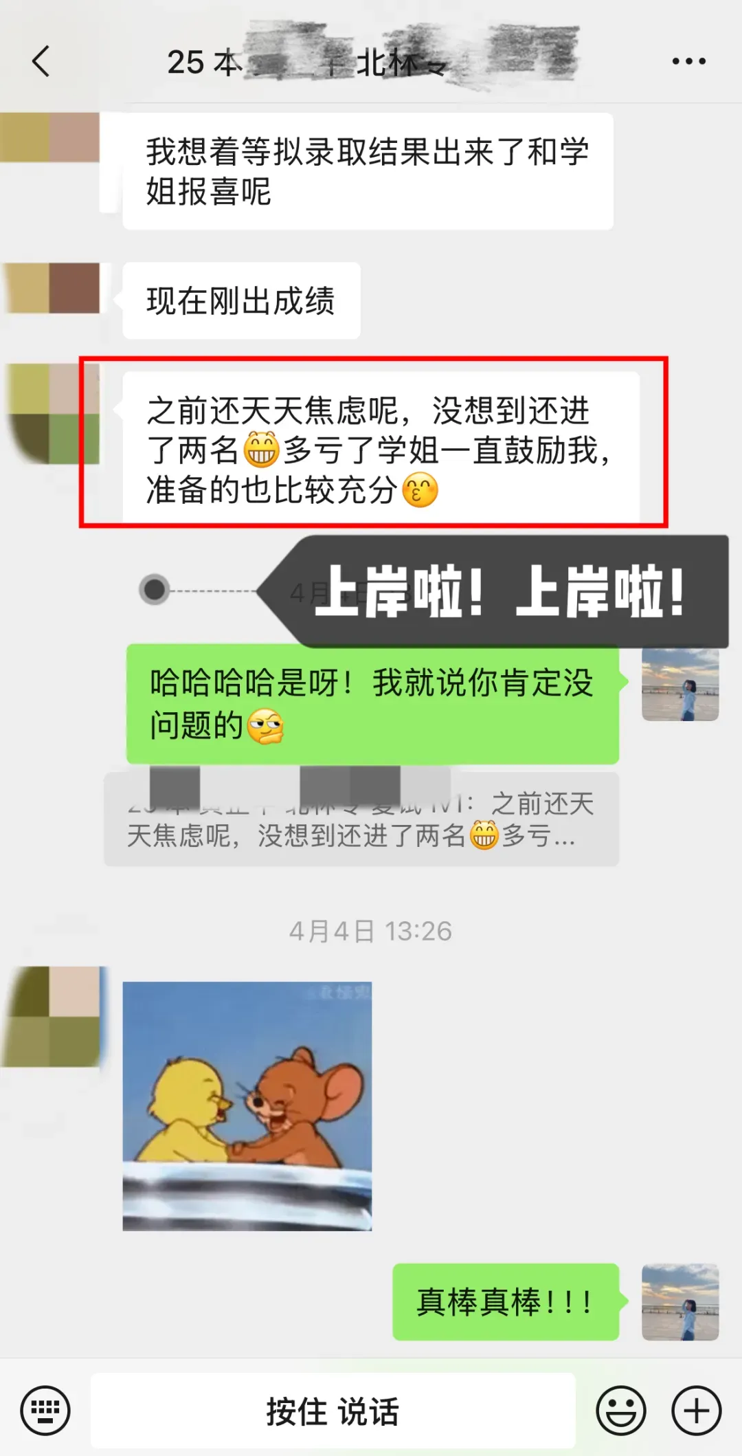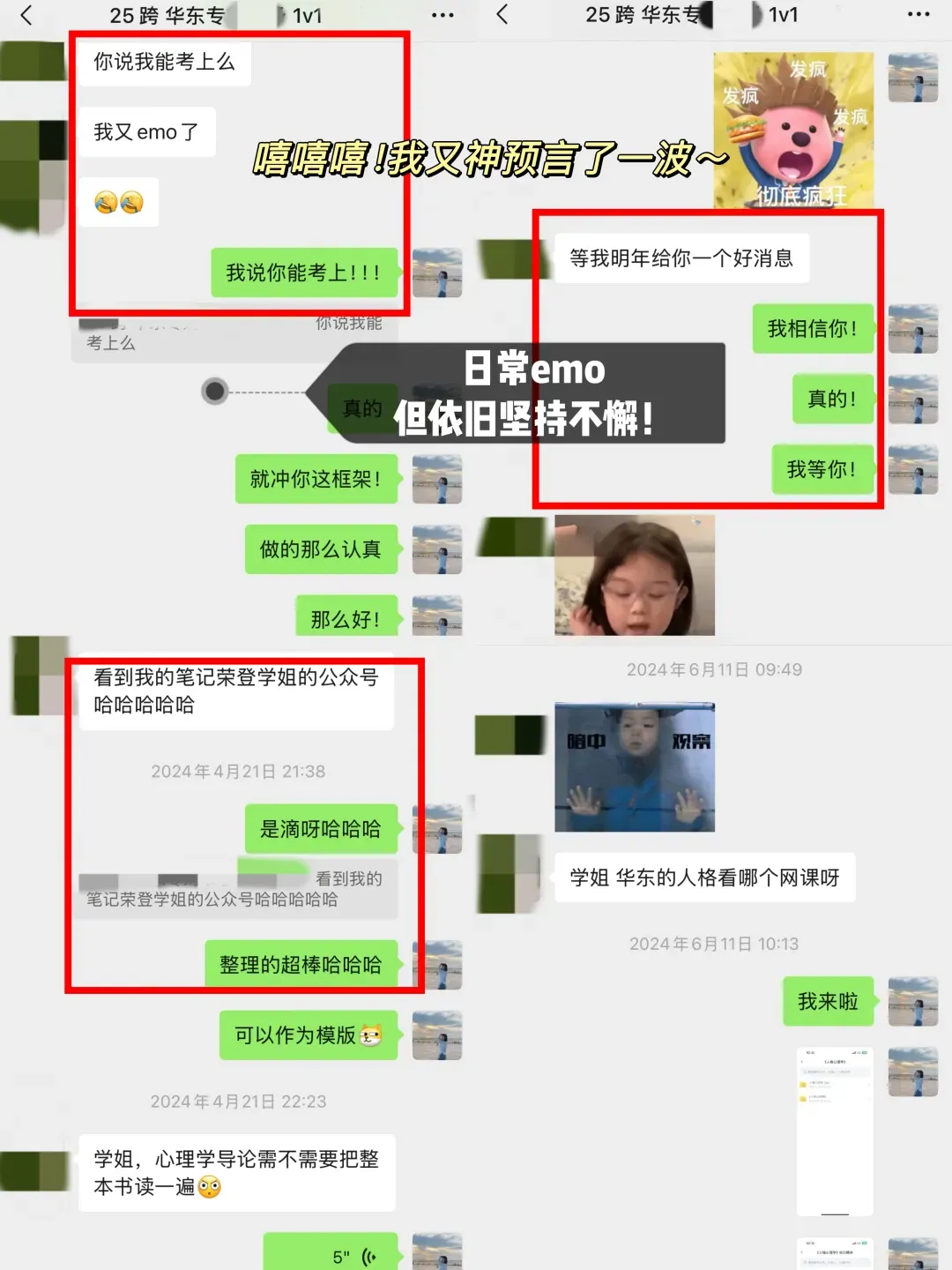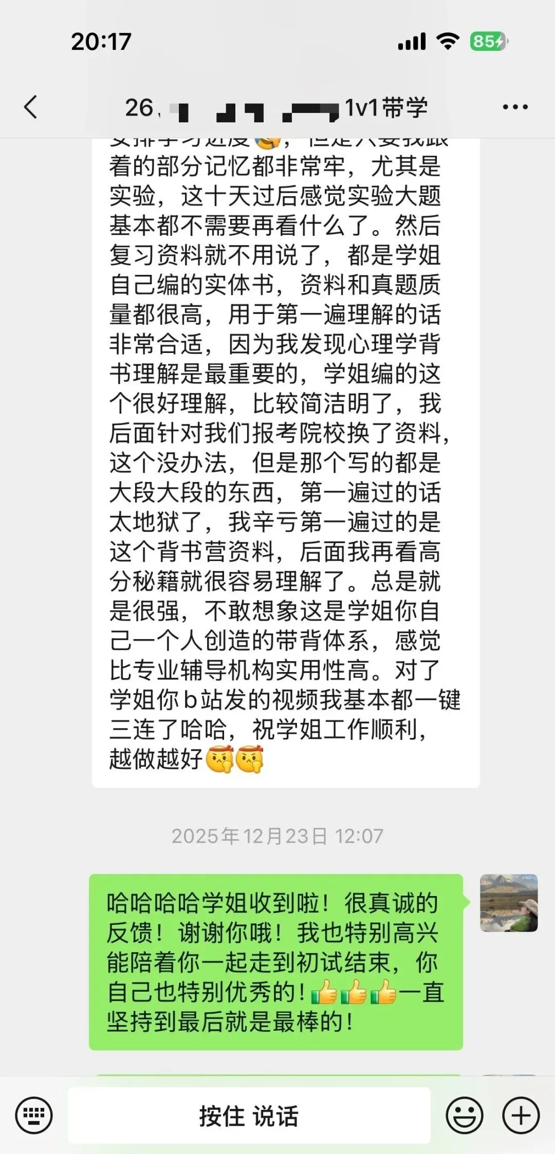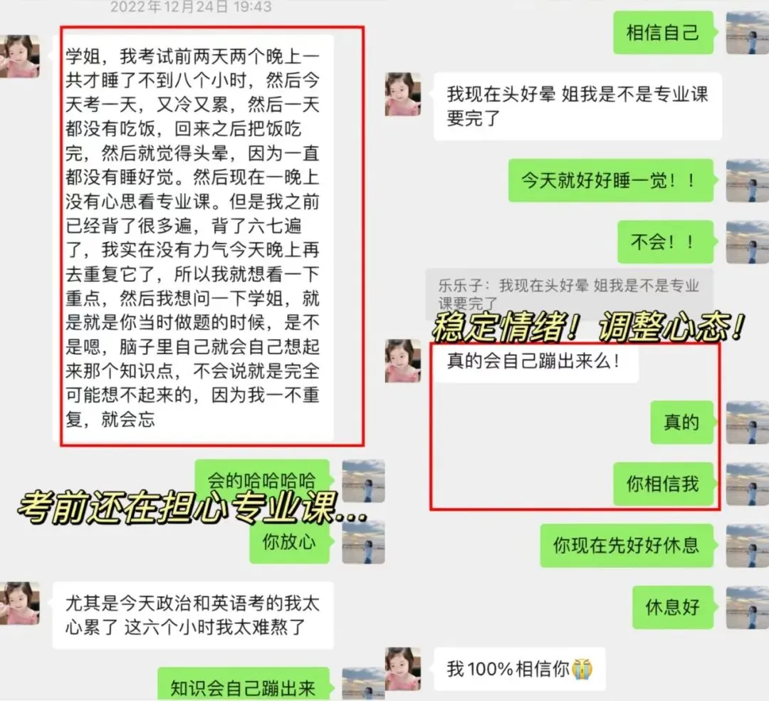 这个上岸北林的学妹一开始➕我的时候,还在纠结学校,后面确定北林之后,就一直按部就班的备考,因为本科就是心理学专业,还是有一些基础,但是在复习备考过程中依旧🈶️很多疑问,也经常会emo,会焦虑,会怀疑自己考不上,但是在这个过程中,我也一直陪伴和鼓励她,所以她也一次次的治愈自己,始终坚持到底不放弃,最终成功上岸啦!