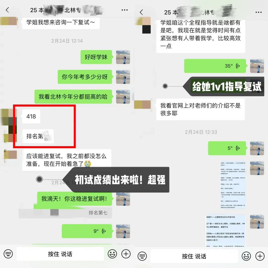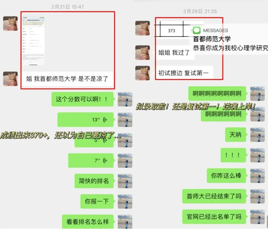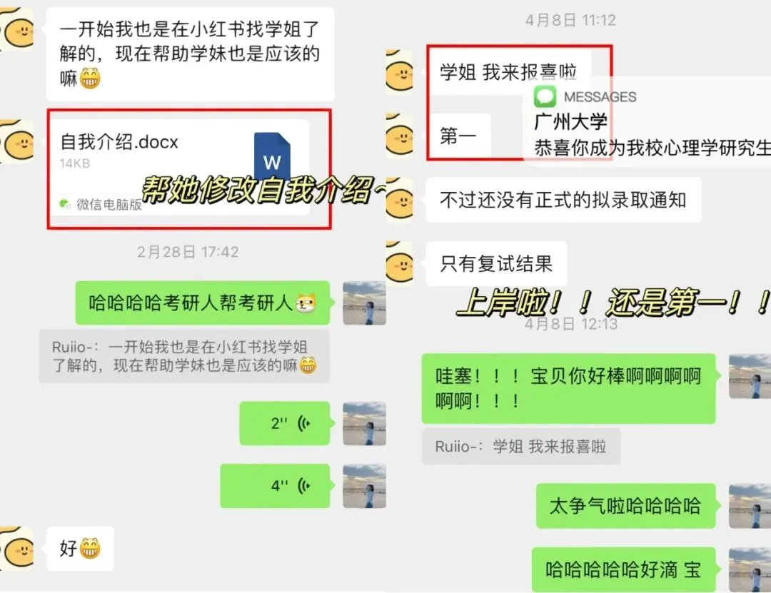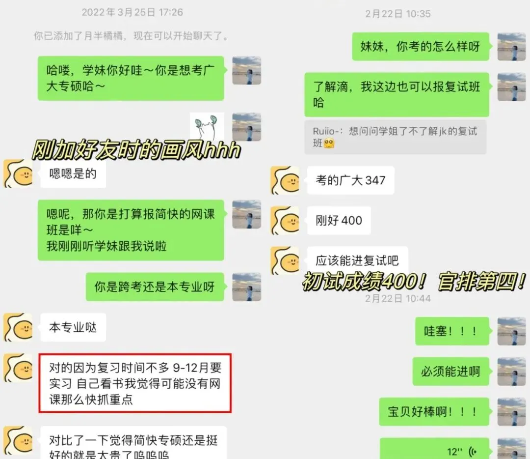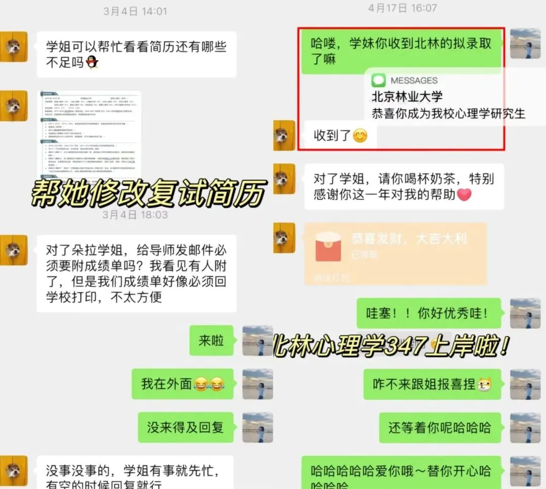 学妹当时加我的时候是22年的3月份,本科是心理学专业,考广大心理学347专硕,后面备考也一直按部就班的跟着辅导班节奏走,后面初试考了400分,超棒!!再后来就复试的时候,我帮她修改了自我介绍和简历,一如既往的优秀hhhhh,后面毫无悬念的复试第一上岸啦!!嘿嘿嘿,咱就是说,贼拉有成就感!