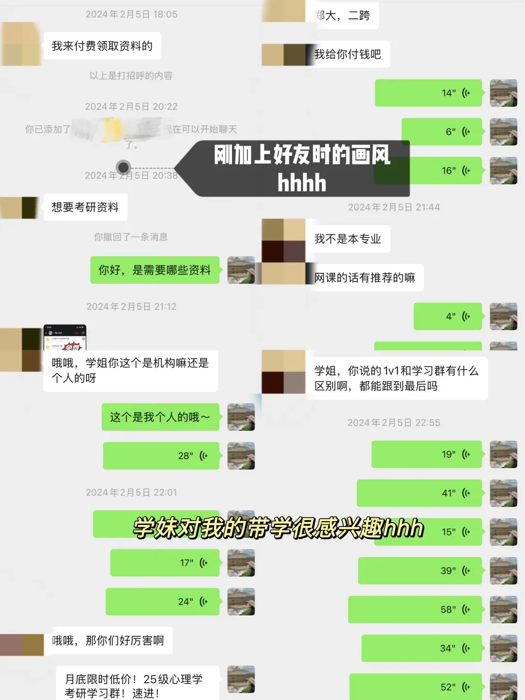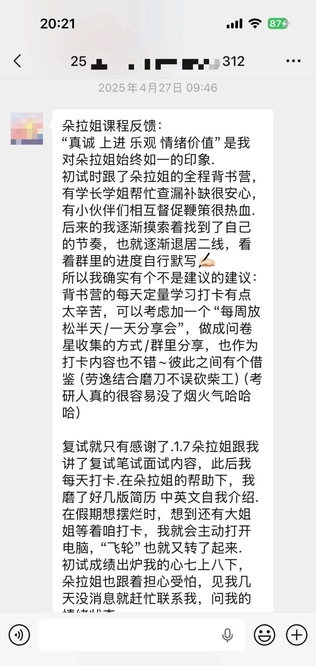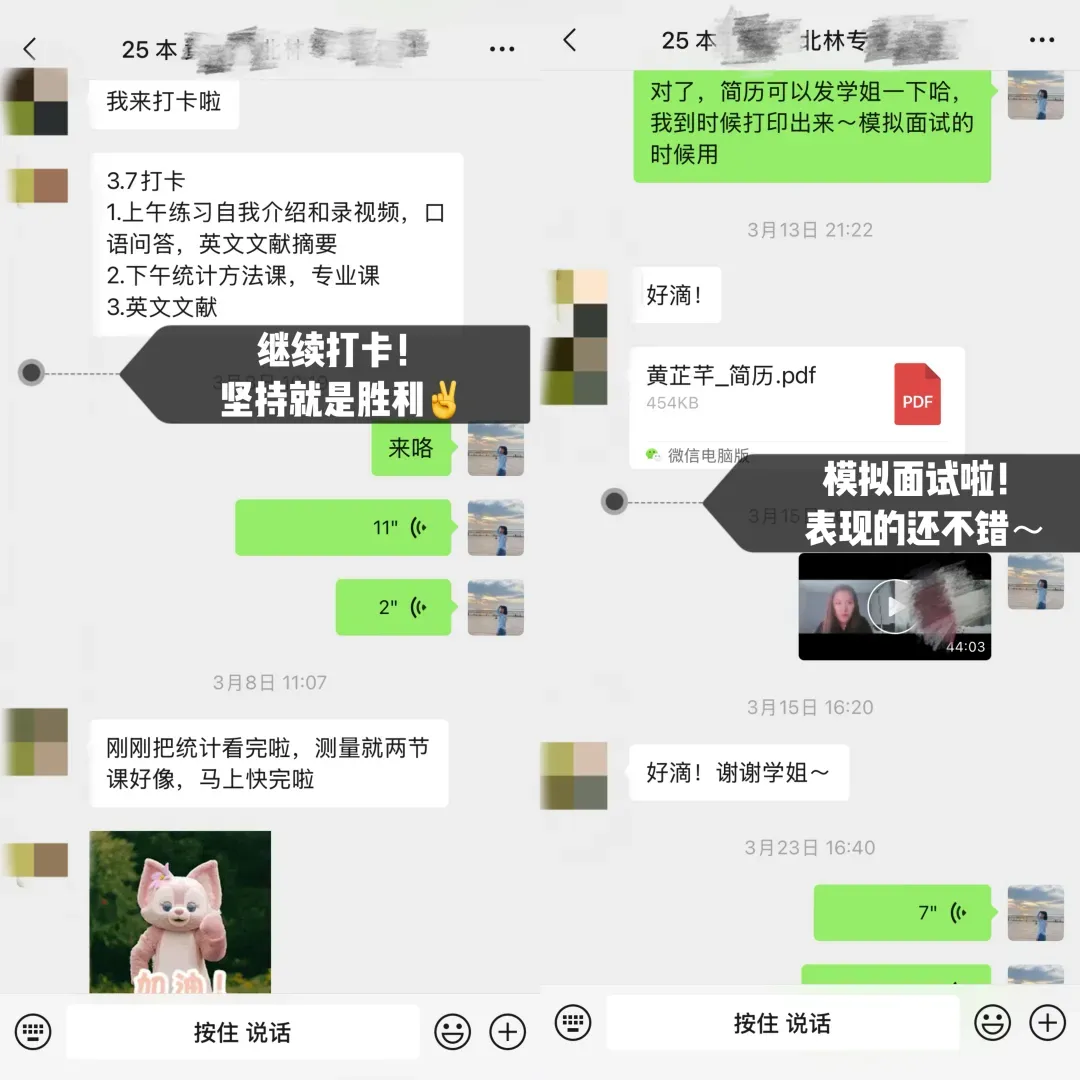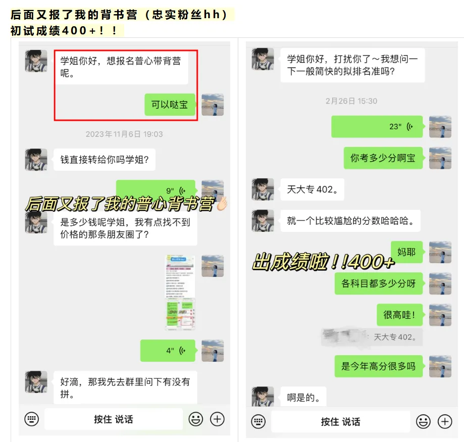 学妹当时加我的时候是22年的3月份,本科是心理学专业,考广大心理学347专硕,后面备考也一直按部就班的跟着辅导班节奏走,后面初试考了400分,超棒!!再后来就复试的时候,我帮她修改了自我介绍和简历,一如既往的优秀hhhhh,后面毫无悬念的复试第一上岸啦!!嘿嘿嘿,咱就是说,贼拉有成就感!
