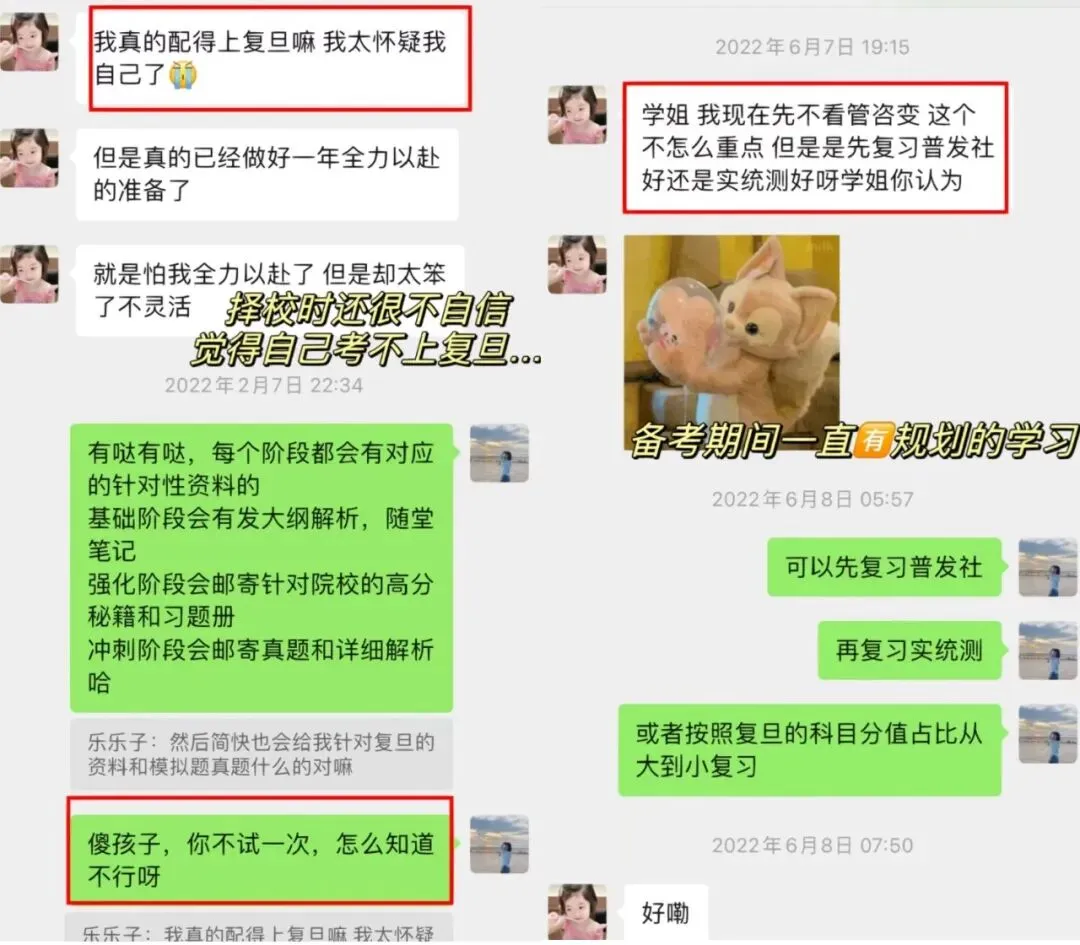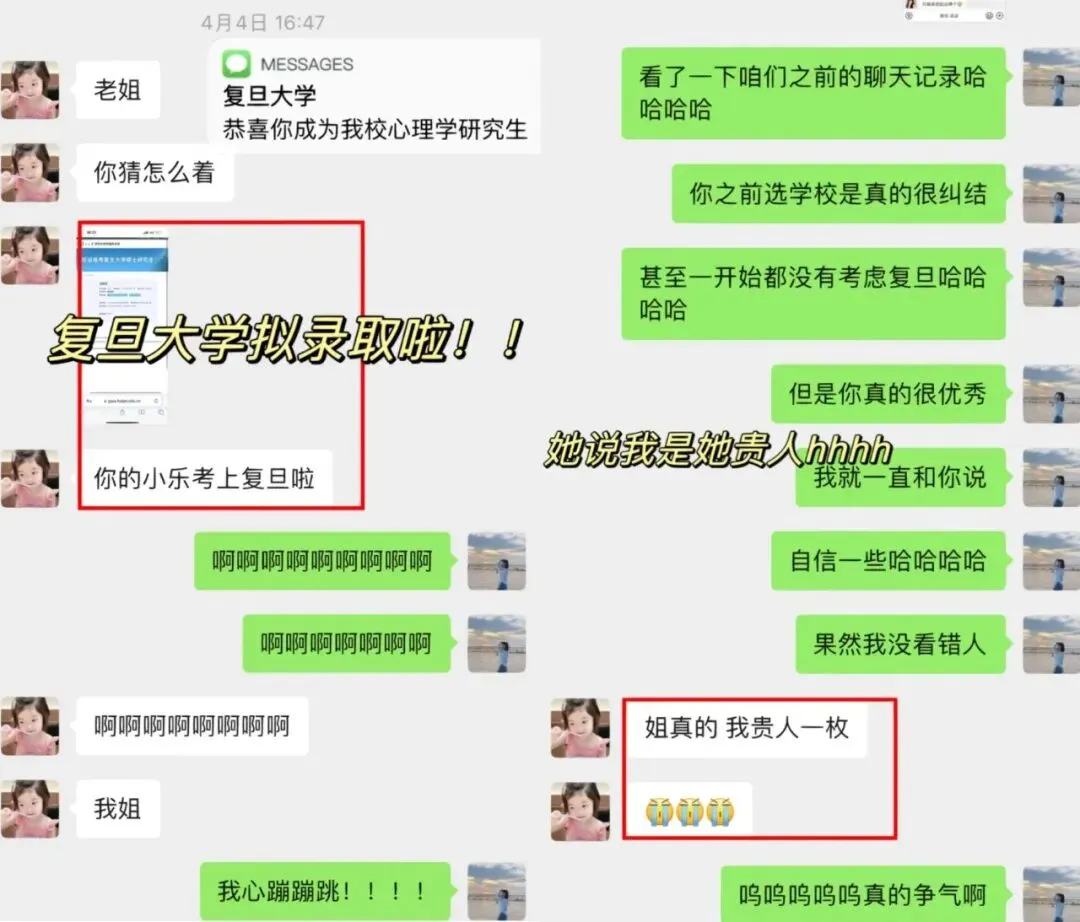 这个学妹本科是一所普通三本,跨考心理学研究生,当时在跟我择校的时候,还觉得自己考不上复旦,不相信自己,后面我一直陪伴和鼓励他,她也是鼓起了很大的勇气去备考复旦,在这过程中非常非常努力!脚踏实地的走好每一步!结果一战从三本逆袭到985,用实力证明了自己,真的超级优秀!同时也让我们看到了,只要努力,只要找准正确的方向,一切皆有可能!!