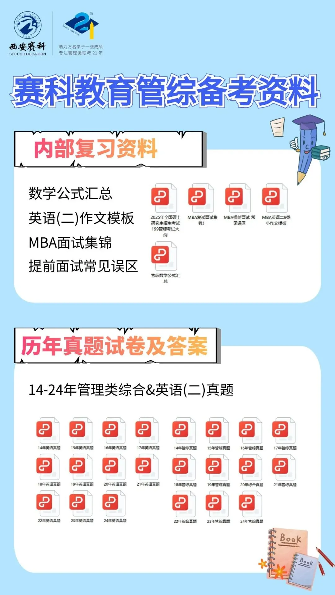 管综数学要解题,公式是基础。你需要熟练掌握各种公式。英语基础差一些且词汇量低,那要如何写呢?针对这类考生,整理了英语二大小作文的模板,最起码套用模板可以拿一些分数,节省一些时间。 可以多刷几遍真题,第一遍可以按照考试时间模拟答题,第二遍则要深入分析每一道题,包括考点、解题方法和错误原因,第三遍可以针对自己薄弱的真题部分,进行重点查漏补缺,以免考场上遇到类似的题,出现丢分的情况。 以上是赛科教育给大家整理的199管综部分备考资料,包括数学公式、英语作文模板、面试集锦以及历年真题等等,还有模考题,有需要的同学可以添加我们老师的微信:祝愿各位同学取得自己理想的成绩