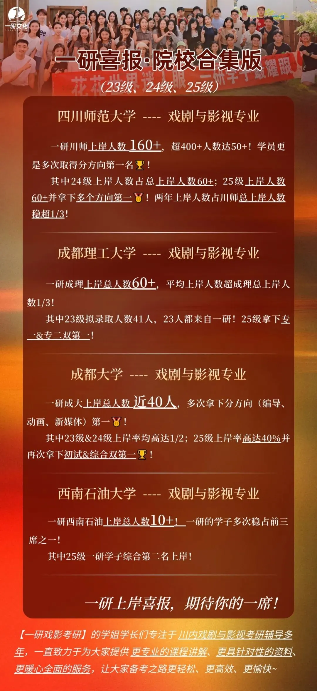 一研戏影扎根成都,深耕戏剧与影视考研辅导4周年。我们不仅是一所辅导机构,更是一群由硕点教授、行业大咖、高分学长学姐组成的“造梦团队”。
