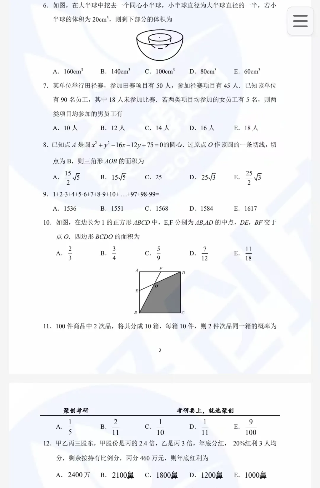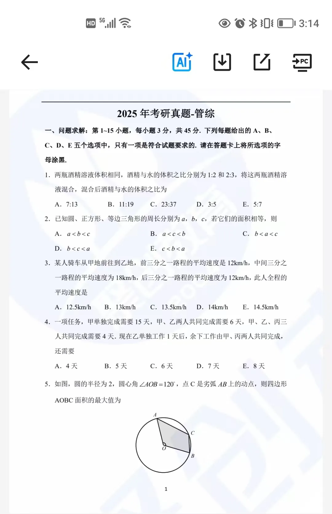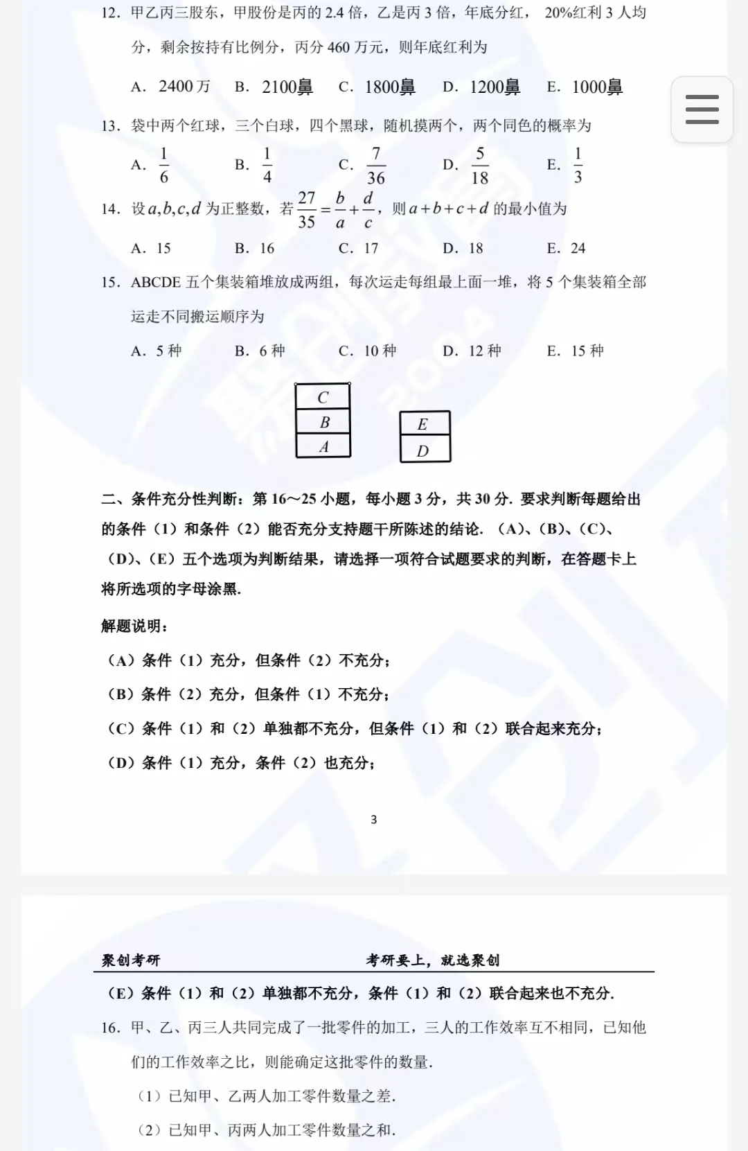 问题求解:15题,每题3分,共45分;五选一单选题,侧重计算与推理。