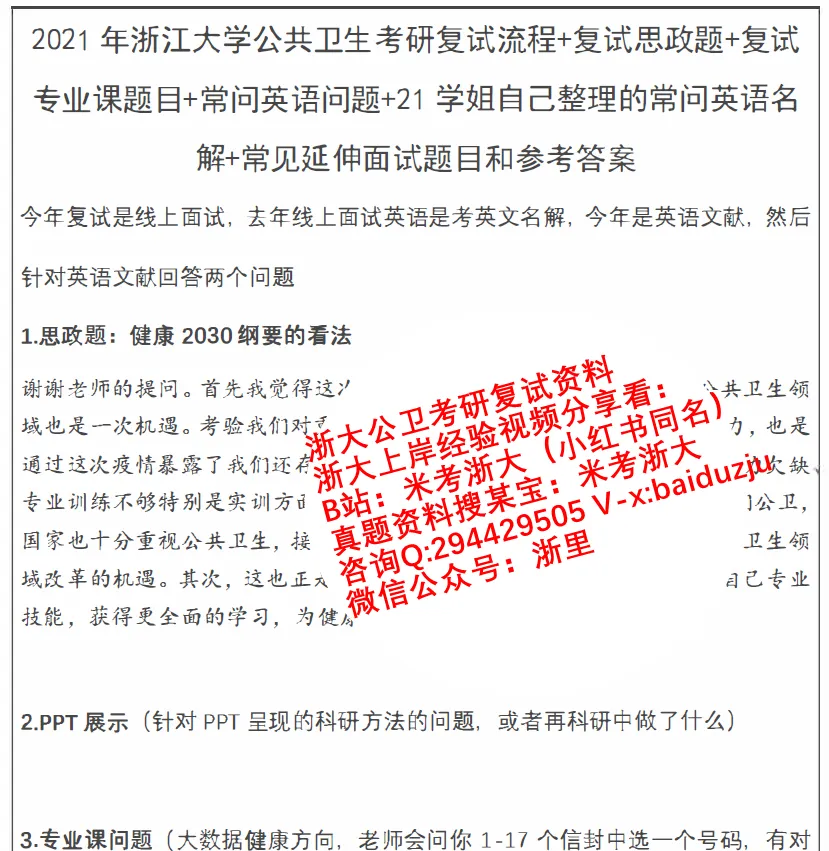 5.2021浙大公卫考研线上复试流程及细分方向复试题