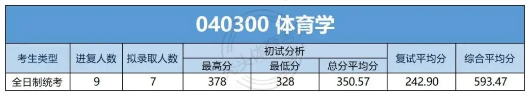 体育学硕士一志愿全日制统考复试9人,拟录取7人,拟录取率77.78%;一志愿全日制拟录取初试最高分378分,最低分328分,拟录取初试总分平均分350.57分