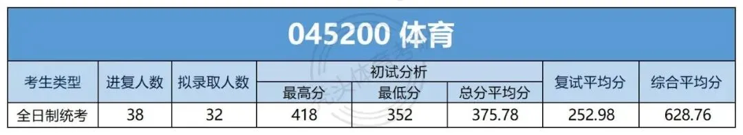 体育硕士一志愿全日制统考复试38人,拟录取32人,拟录取率84.21%;一志愿全日制拟录取初试最高分418分,最低分352分,拟录取初试总分平均分375.78分