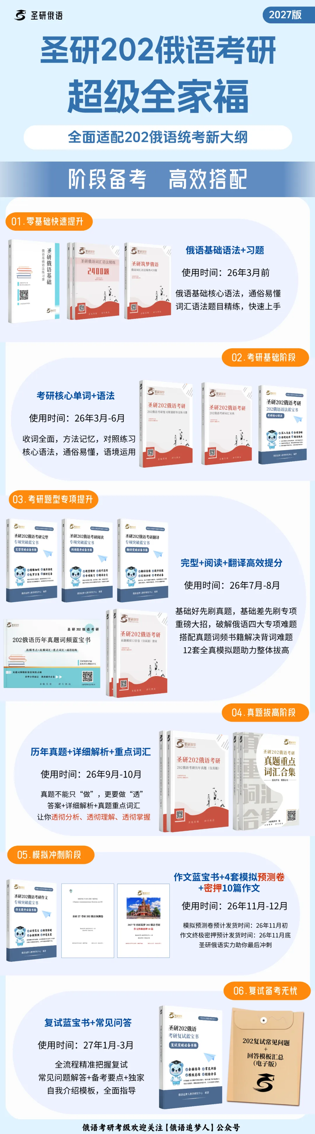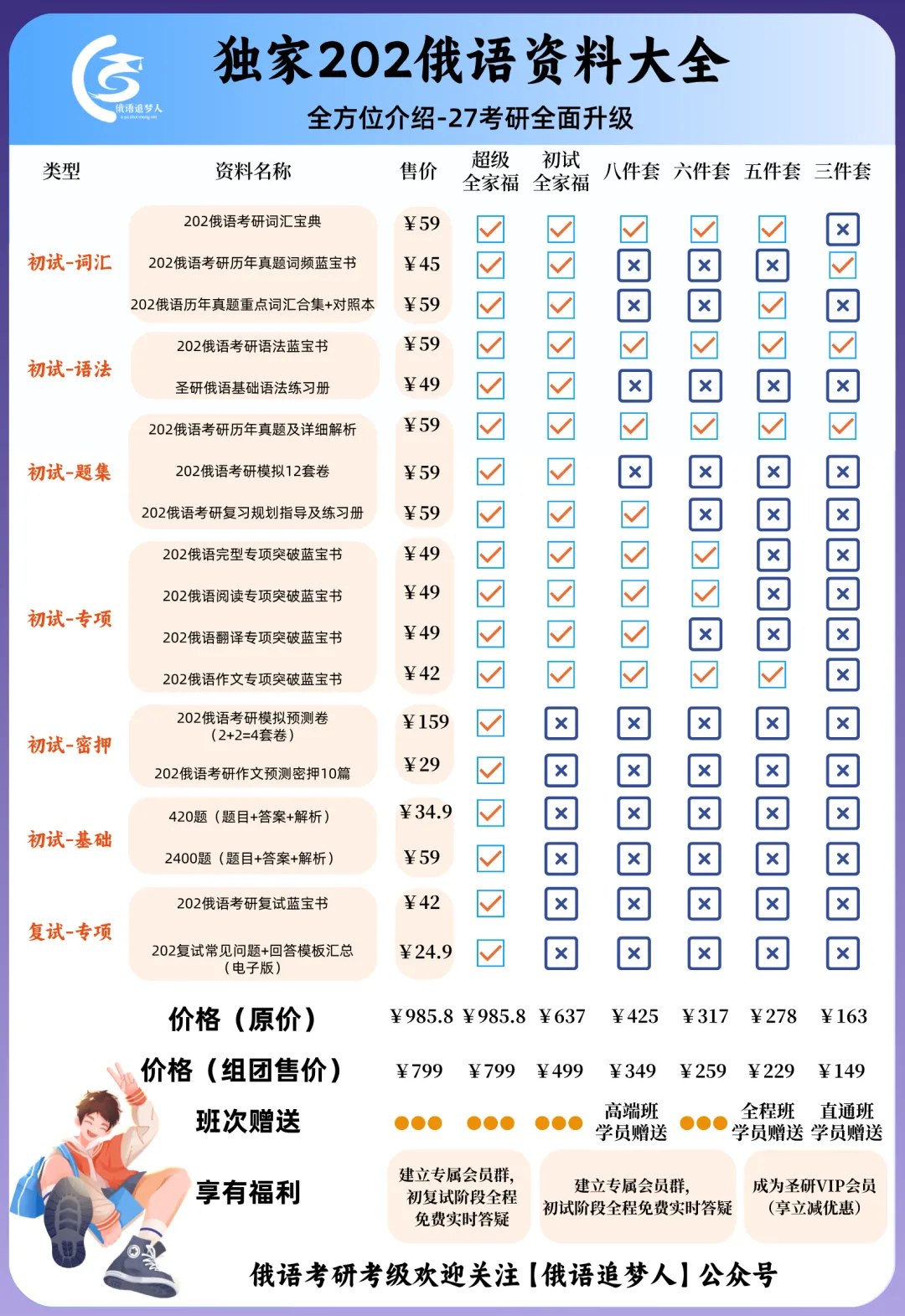 亲爱的考研学子们,新的一年为在考研的路上陪伴大家继续前行,逐梦成功,俄语追梦人团队对27考研书籍课程进行了全面更新,不仅大幅提升了书籍质量,还推出了更多元的书籍,让202俄语学子的选择更加多样化。更高质量更加多元化的书籍,全方位助力备考。接下来,就让我们一起深入了解这些书籍的亮点吧!