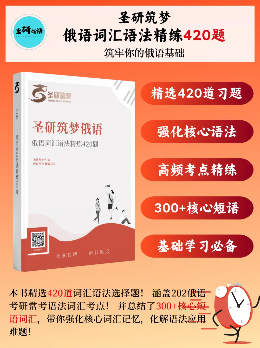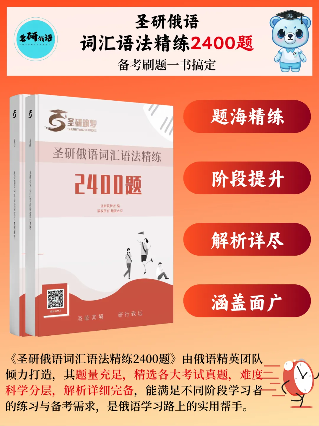 书籍简介:《圣研俄语词汇语法精练2400题》由俄语精英团队倾力打造,其题量充足,精选各大考试真题,难度科学分层,解析详细完备,能满足不同阶段学习者的练习与备考需求,是俄语学习路上的实用帮手。