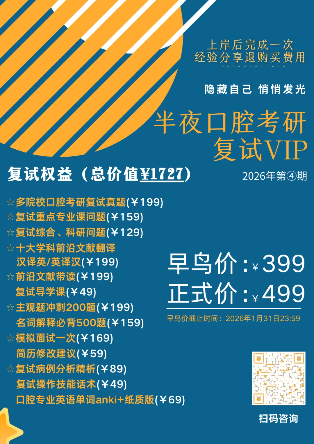 ①本次复试资料为防盗版,要求提供身份证(反面,有信息面,照片可标注“仅用于半夜口腔考研审核”)、准考证,纸质资料会以身份证号作为水印(二)上岸完成经验分享退费说明(2026年4月详细说明)初步退费规则:提供考研上岸证明,完成一次经验分享,将退加入VIP一半费用2026年半夜口腔考研复试VIP第④期服务周期:2026年1月19日至2026年4月30日复试全程班说明
