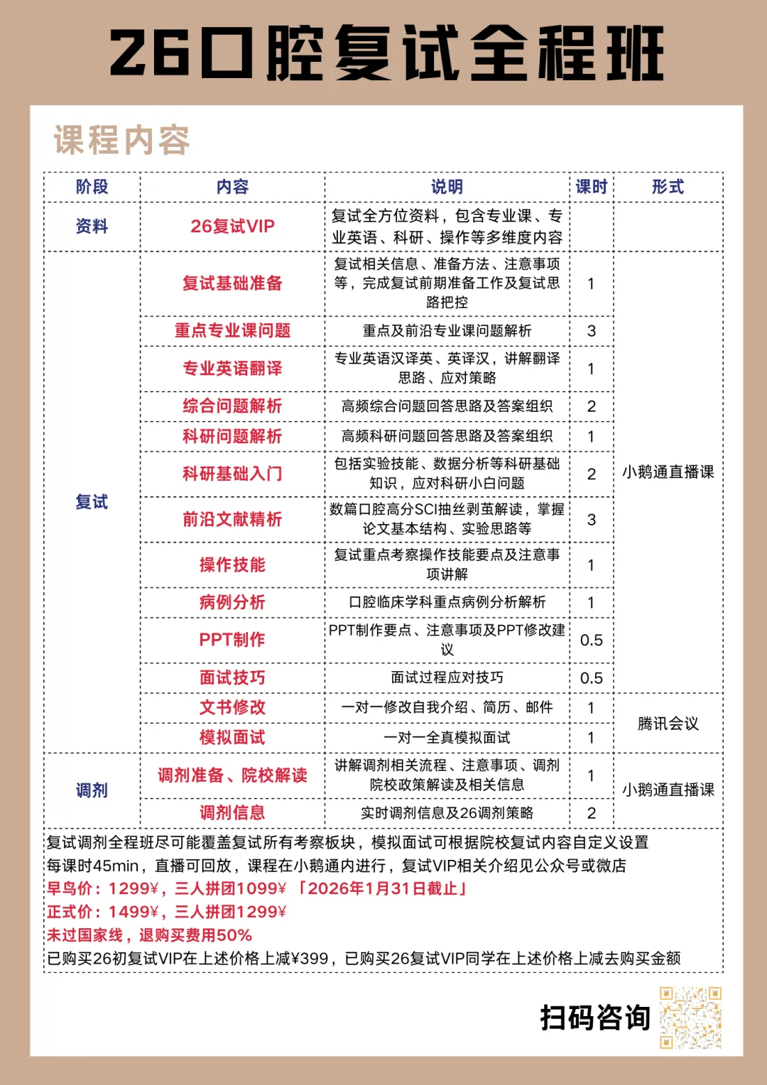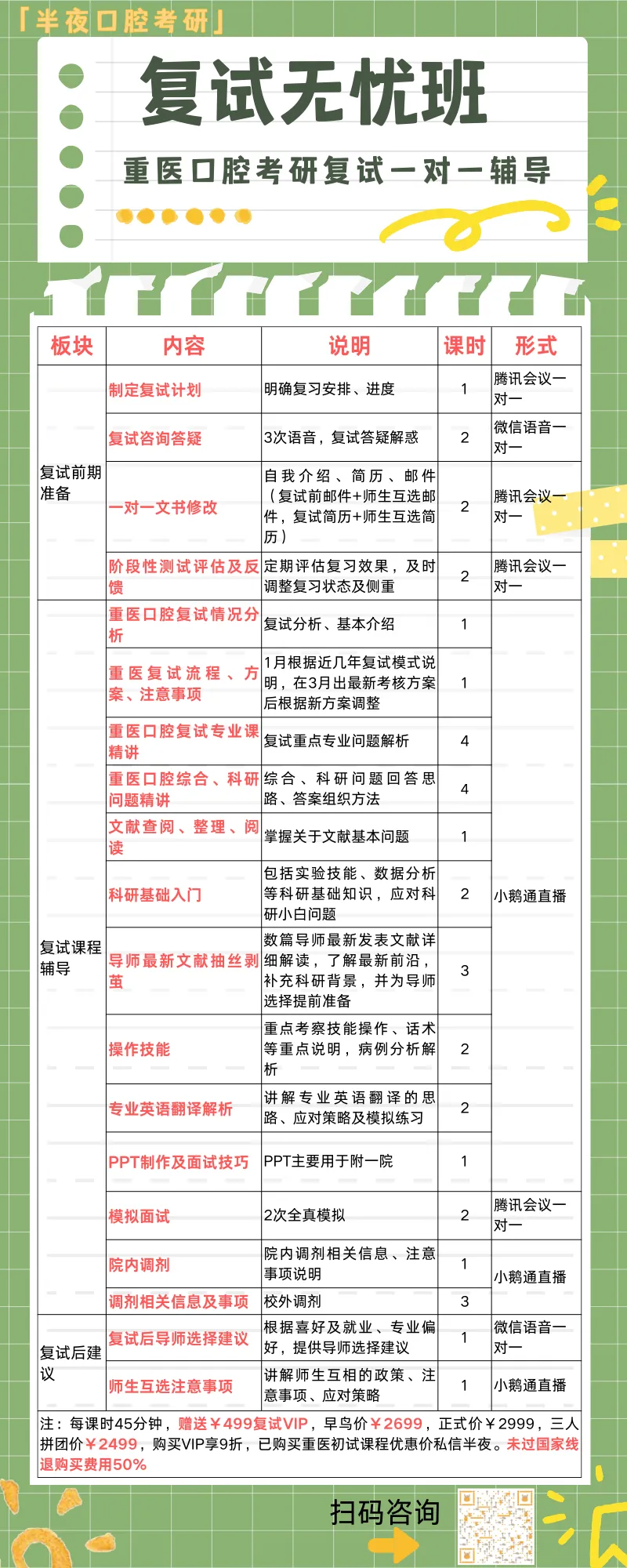 早鸟价¥2699,正式价¥2999,三人拼团价¥2499若购买「半夜口腔考研26VIP」,重医复试无忧班享9折