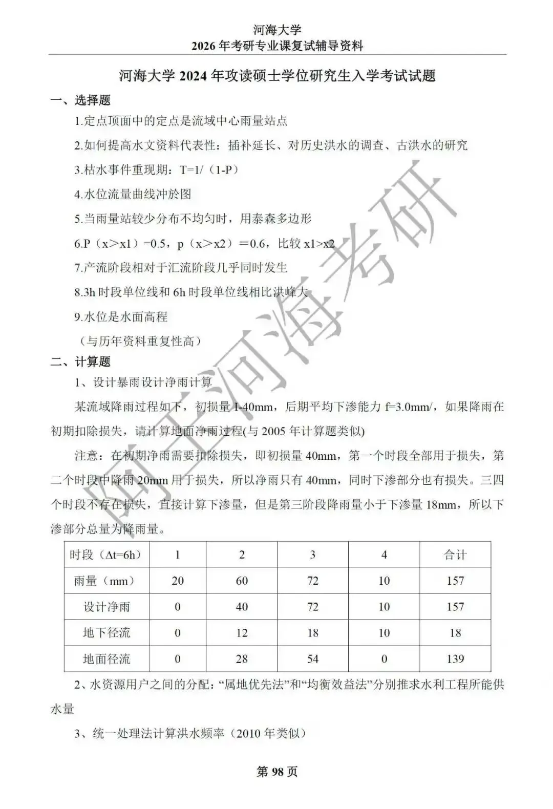 【26河海考研】复试资料推荐:001001水文水资源综合