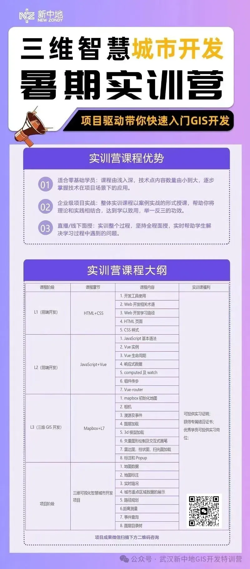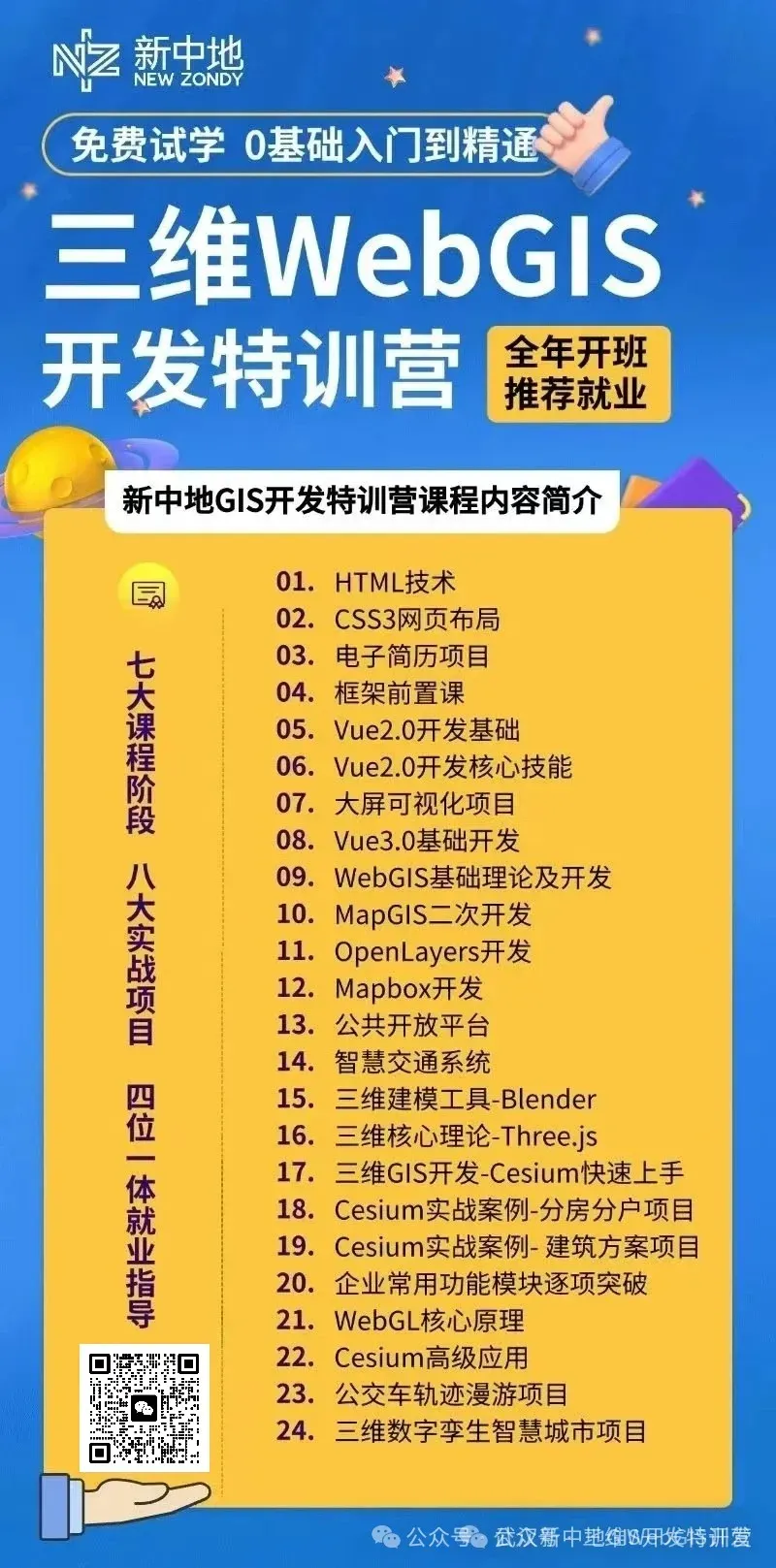 在此基础上,以新中地GIS开发特训营,构建出了国内首套GIS开发工程师培养课程体系,涵盖了GIS开发的各个领域和技能,同时还提供完整的项目开发实践,以便让学生们能够真正掌握所学知识,成为市场和企业需要的实用性人才。