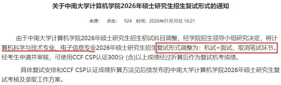 最近各院校陆续发布复试相关通知公告!其中:中国传媒大学昨天上午10点已开始提交报考资料;中南大学计算机学院计算机科学与技术专业、电子信息专业取消笔试环节!