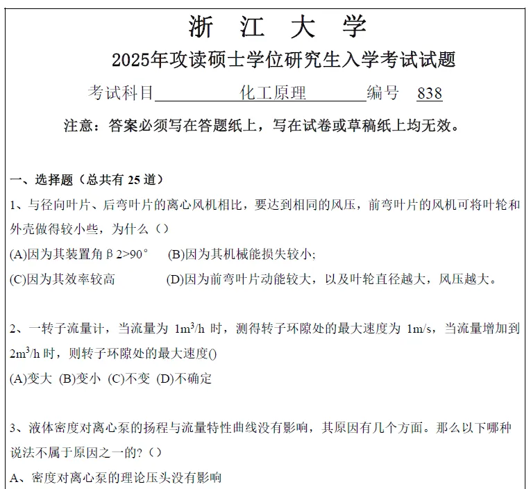 12025浙大化工原理(838)考研模拟预测押题试题一