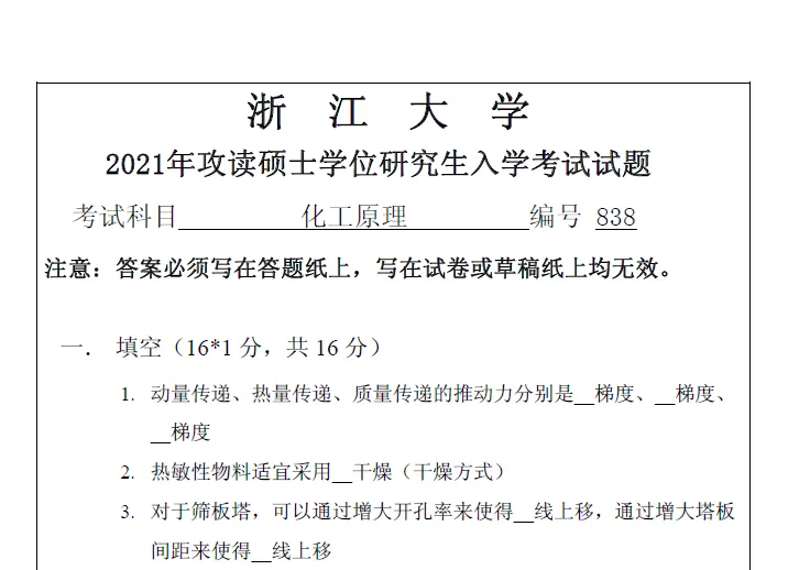 12026浙大化工原理(838)考研模拟预测押题试题一