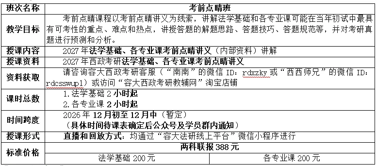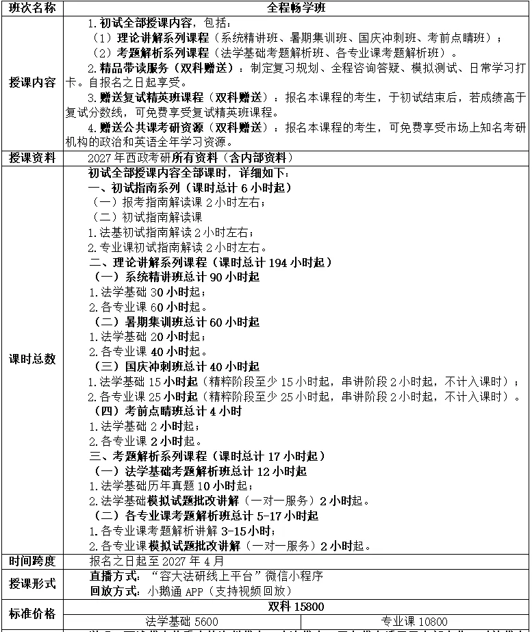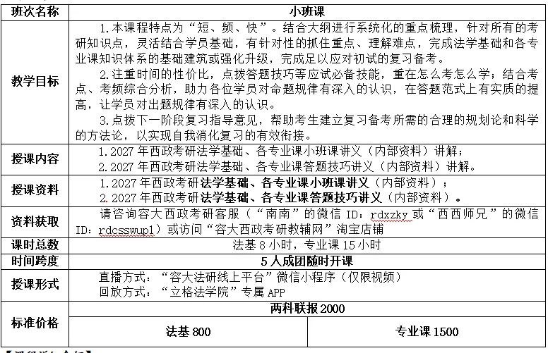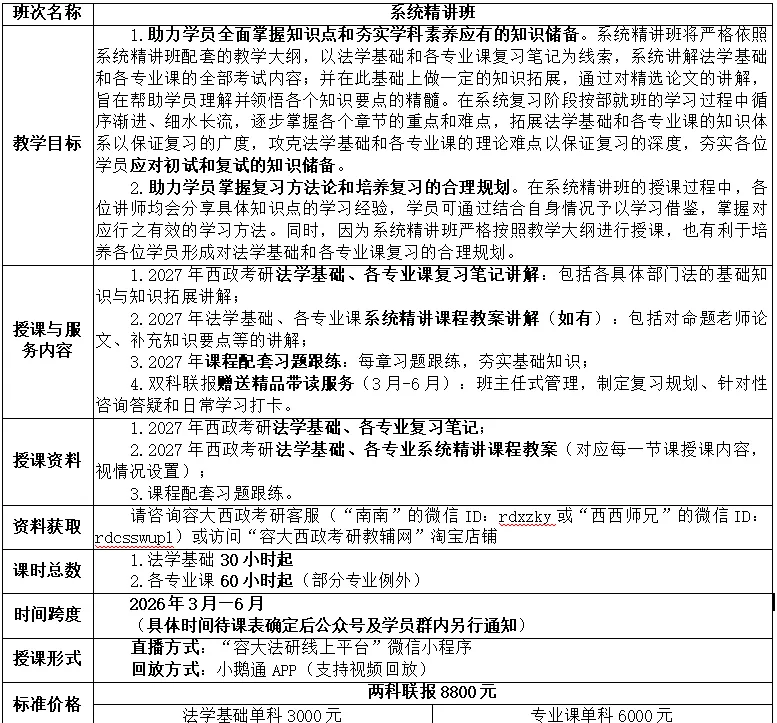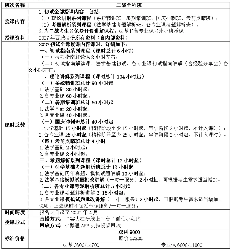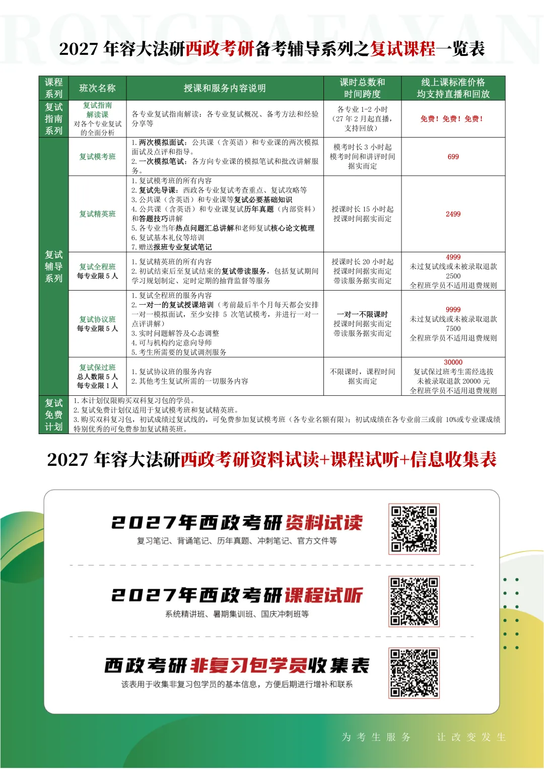 以上为27西政考研的课程、资料清单,包括各项资料和课程的内容和价格,请各位同学详细查看,如确定了考研专业,即可咨询入手哦!趁现在还有优惠!