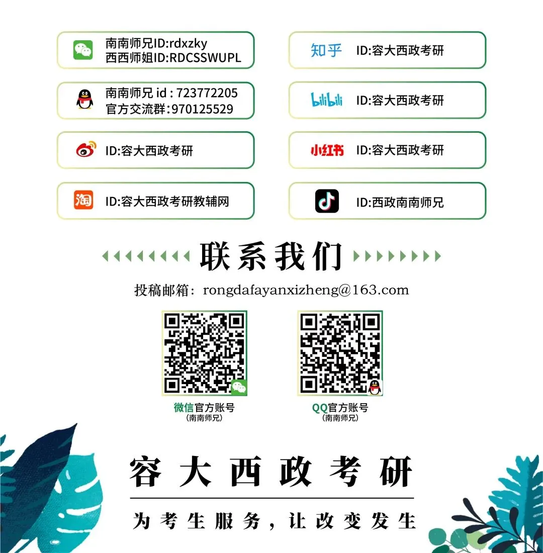 当然由于上述资料、课程内容较多,我们之后也会针对每一项资料、课程进行详细介绍,请各位同学持续关注容大西政考研公众号。