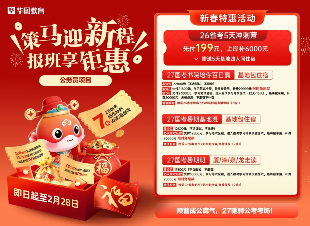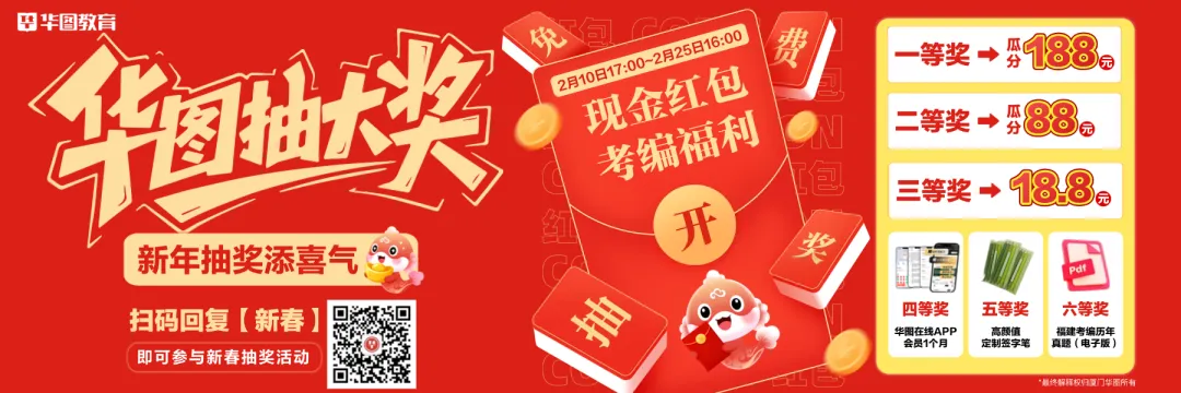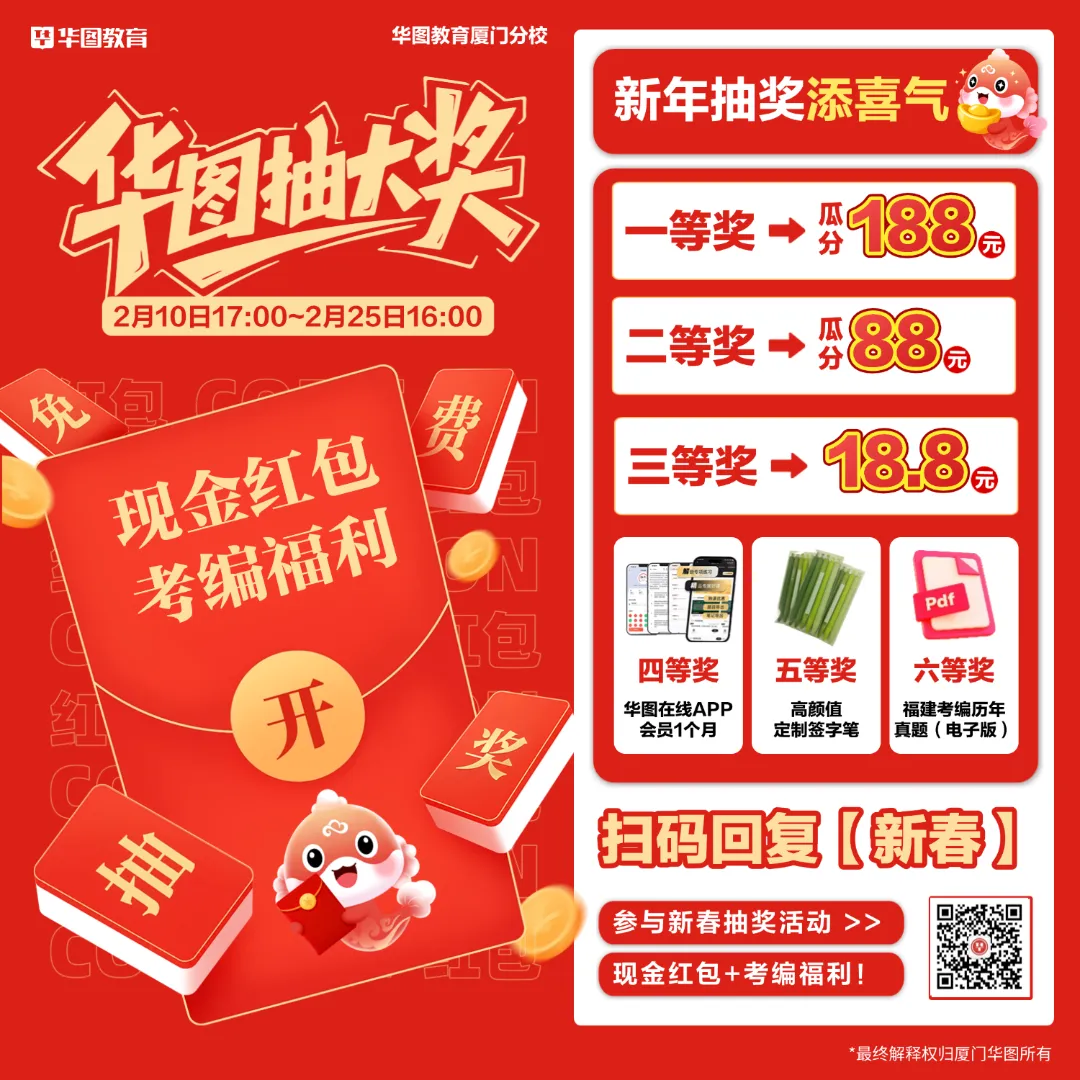 这个新春,拒绝空手而归!锁定厦门华图新春抽奖活动,一边领现金红包沾喜气,一边拿考编福利强实力。愿你在 2026 年,逢考必过,成功上岸,马到功成!
