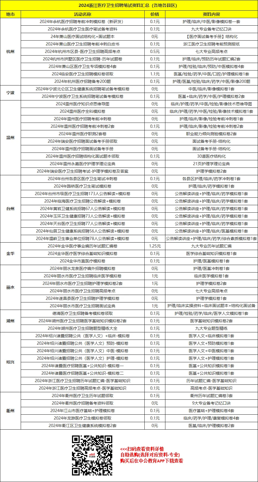 浙江医疗卫生招聘考试信息持续发布中,请大家提前做好备考工作。浙江医疗各地市各县区考情都有所不同,除了浙江通用版资料,我们还准备了各地市单独的备考资料,更具针对性,涵盖模拟卷、冲刺卷、知识点等。可点击购买入口查看详情进行购买。全省通用版资料点击:浙江医疗考编笔面试资料推荐!0-12元自助选购!