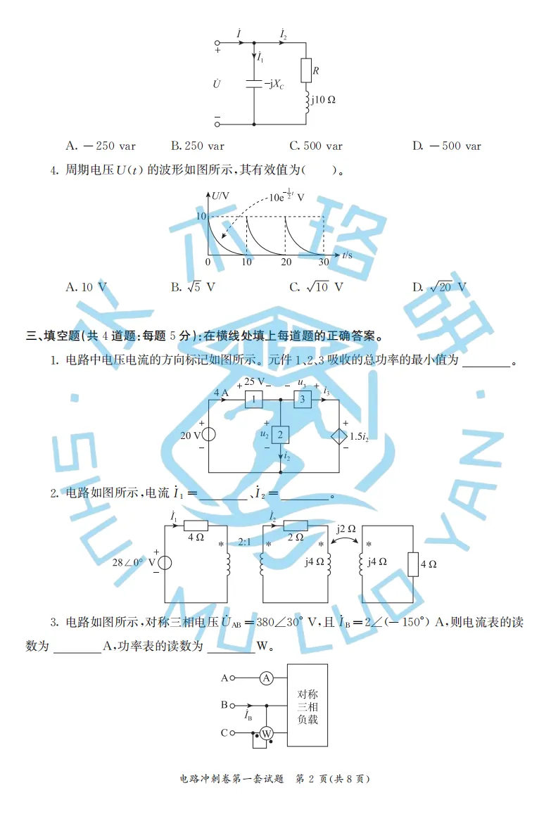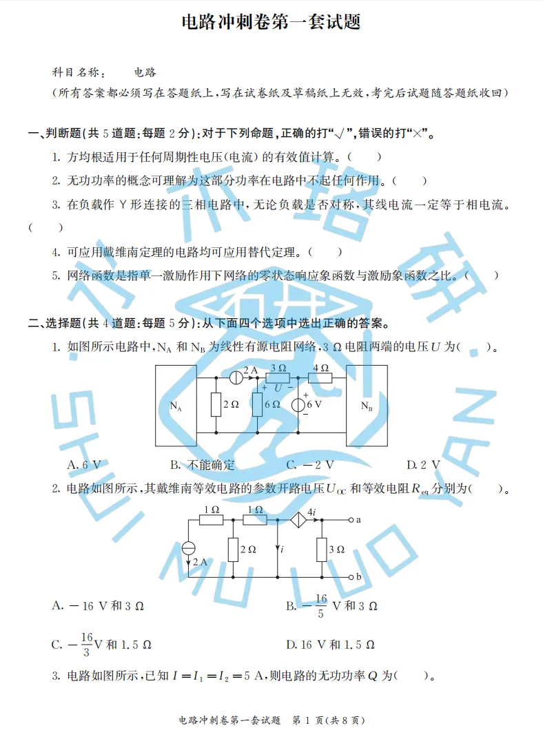 本套习题根据《电路》考试大纲,将题目分为了:电阻电路分析、动态电路分析、正弦稳态分析、非正弦周期电路和二端口参数电路5大类。