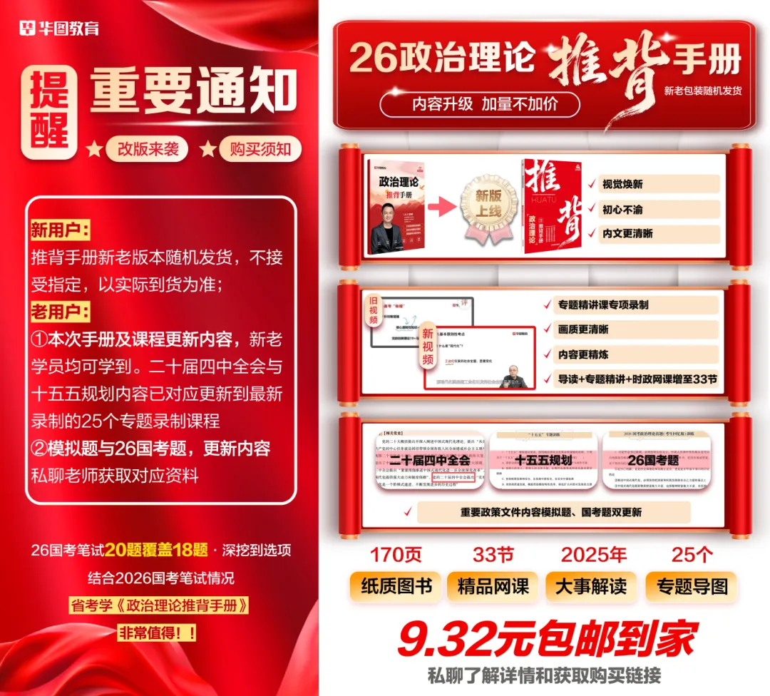 📺课程:专题精讲课,高清屏重新录制📚图书:封面排版双更新观感更舒适📰内容:加入二十届四中全会、“十五五”内容📖习题:模拟题增至120题,新增26国考试题