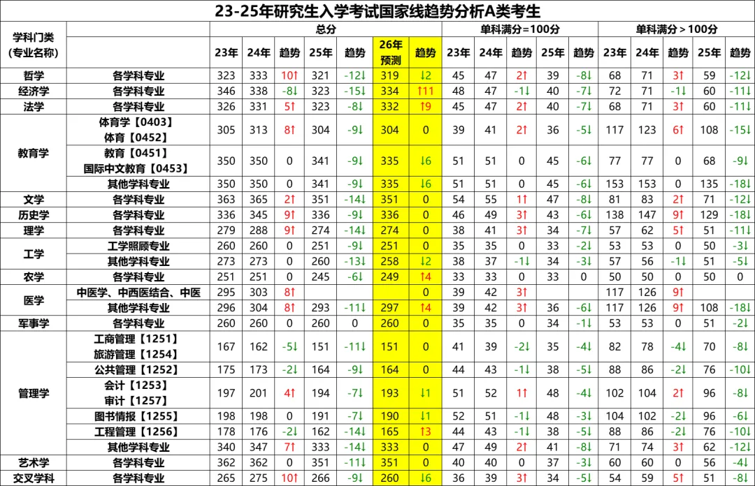 纵观2023-2025年国家线及2026年预测数据来看,今年考研A类考生分数线整体呈现“稳中有降、局部升温”的特点: