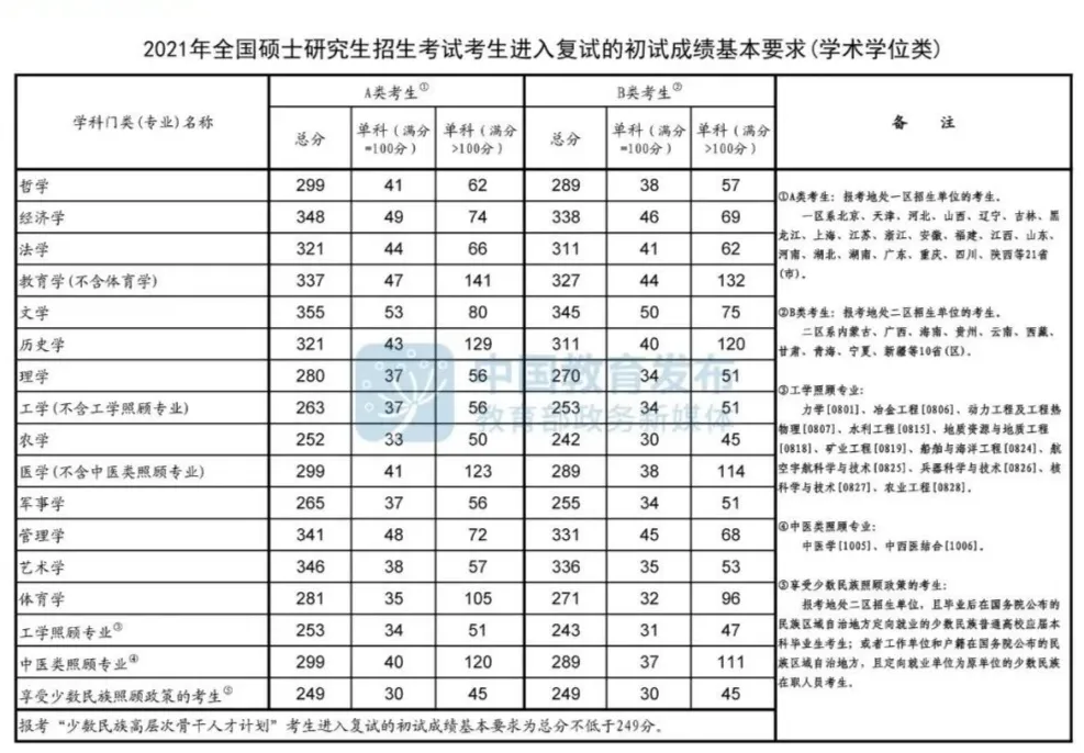 考研国家线总体上分为学术型复试分数线和专业学位类分数线,也就是通常所说的学硕和专硕复试线。国家划定的总分分数线就是在总分方面要求考生须达到的分数要求。